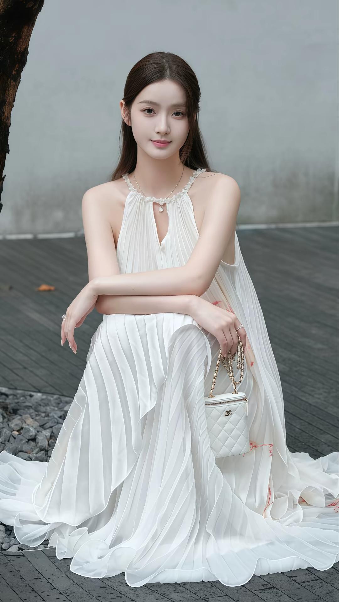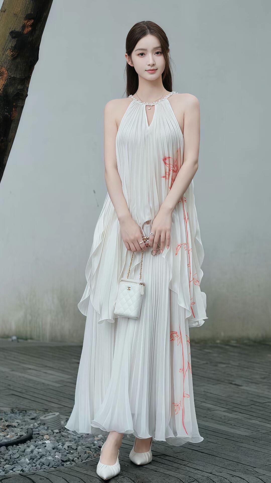 《花园中的白色精灵》 初夏的晨光穿过梧桐叶隙,在庭院里织就斑驳的光网。微风拂过时,裙摆的薄纱便与悬铃木的绒絮共舞。她站在木质平台上,米白色连衣裙泛着珍珠母贝般的光泽,V领处垂落的珍珠项链随着呼吸轻轻起伏,仿佛露珠在晨荷上颤动。 裙身上盛开的绯红山茶最是动人,丝线勾勒的花瓣从腰间蔓延至裙褶,针脚细密得如同工笔画的渲染。当阳光斜切过裙裾,那些暗纹刺绣便呈现出深浅不一的红——胭脂色、珊瑚色、朱砂色层层晕染,像是把整个玫瑰园绣进了云朵里。她伸手整理耳坠时,腕间三枚戒指折射出细碎金芒,与珍珠光泽在空气中碰撞出清脆的声响。 脚边的碎石小径蜿蜒隐入绣球花丛,蓝紫相间的花球还凝着夜露。她驻足的位置恰好在光影交界处,左肩沐浴着晨光,右肩仍浸在树影里,整个人像幅未干透的水彩画。手中的菱格纹小包垂着流苏穗子,每当风起,那些银线编织的穗子便在空中划出看不见的五线谱。 远处喷泉的叮咚声被风揉碎了送来,她忽然侧首望向某处,睫毛在脸颊投下蝶翼般的阴影。这个瞬间,裙裾的褶皱恰好形成完美的波浪弧度,珍珠项链第三颗珠子滑进锁骨凹陷处,连空气都凝固成琥珀。背景虚化的绿意里,隐约可见石雕天使捧着陶罐,水流正从罐口溢出,在晨光里碎成水晶帘幕。 当第一缕真正炽热的阳光刺破云层时,她终于迈开脚步。高跟鞋叩击木板的声响惊醒了睡在紫藤架下的虎斑猫,那生灵伸着懒腰踱过来,尾尖扫过她曳地的裙摆,留下几根金棕色的毛发,成了这幅画里最灵动的笔触。