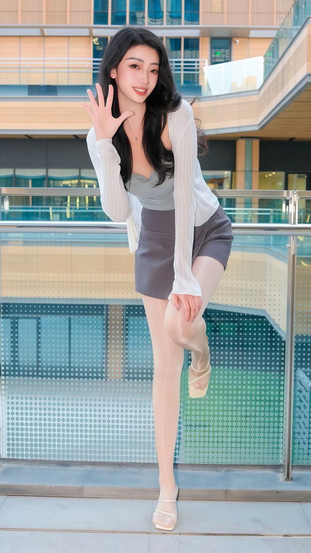 《午后时光》 一个阳光明媚的午后,一位女子静静地坐在公园的长椅上,享受着属于自己的宁静时光。她身穿一件灰色连衣裙,外面搭配了一件白色的长袖开衫,显得优雅大方。她的黑色长发自然地垂落在肩头,随着微风轻轻飘动,给人一种温柔恬静的感觉。她脚上穿着一双浅色的透明丝袜和浅色的高跟凉鞋,使她的整体造型更加精致时尚。 周围的背景中,绿色的灌木丛生机勃勃,一些建筑物上的玻璃窗在阳光下闪闪发光。建筑物上有着明显的数字标识“2”,仿佛在默默诉说着这个地方的故事。整个环境干净整洁,光线明亮,营造出一种轻松愉悦的氛围。女子坐在长椅上,眼神望向远方,似乎在思考着什么,又或许只是在享受着这片刻的宁静。她的脸上带着淡淡的微笑,仿佛对生活充满了美好的期待。 这个画面就像是一幅美丽的画卷,将人与自然的和谐完美地展现出来。在这里,时间仿佛静止了,一切都显得那么美好而宁静。