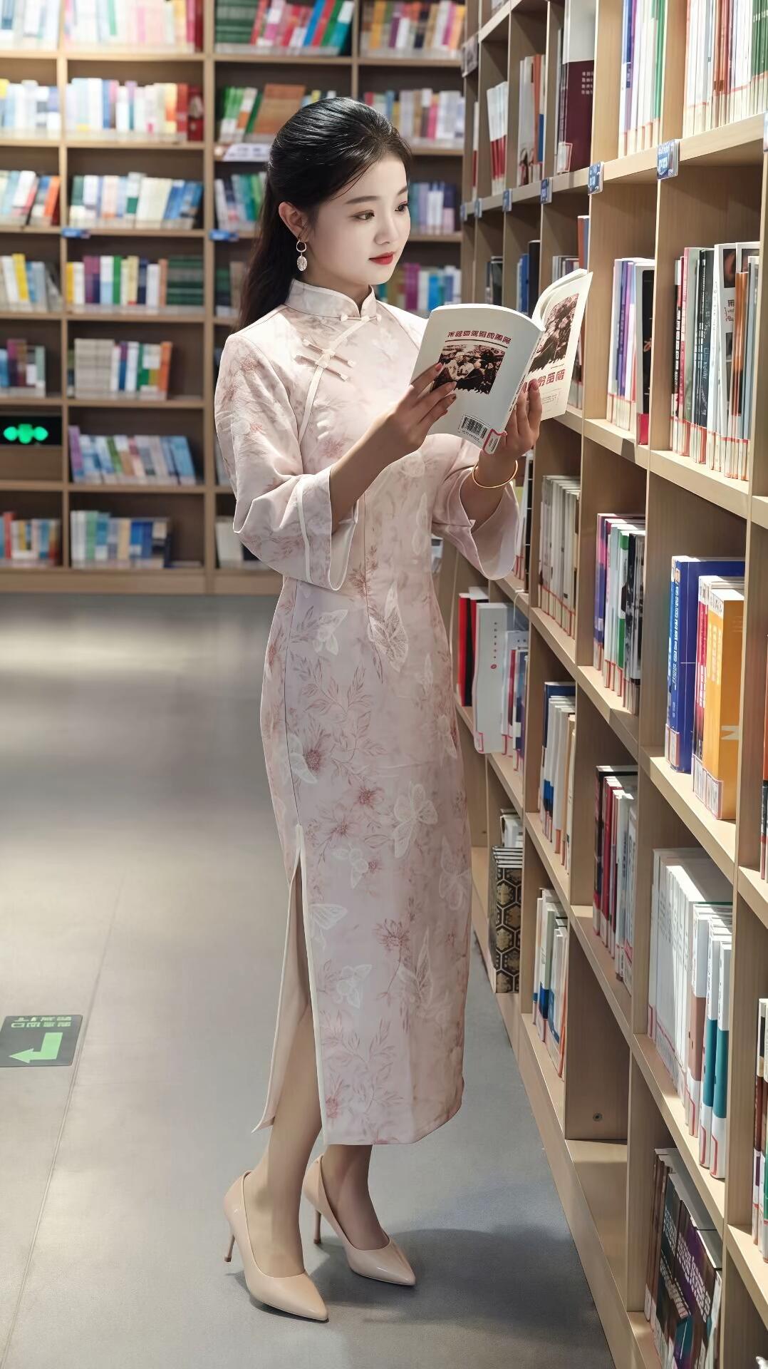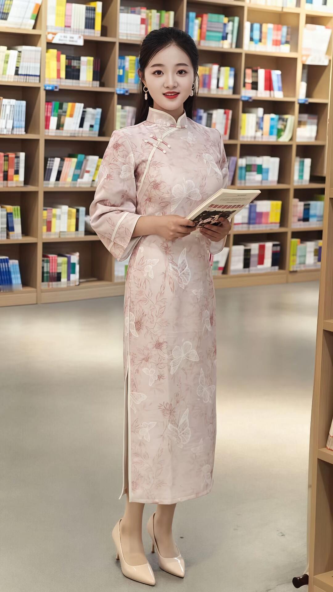 在静谧的图书馆里,阳光透过高大的玻璃窗,洒在排列整齐的书架上,营造出一种温馨而宁静的氛围。一位身着粉色旗袍的女子,优雅地站在灰色的塑料凳子上,她的存在仿佛为这个知识的殿堂增添了一抹亮色。 旗袍上的花卉和蝴蝶图案,淡雅而精致,每一针每一线都透露出传统工艺的魅力。领口和袖口的白色盘扣,如同小巧的艺术品,点缀着她纤细的脖颈和手腕。她手中捧着一本红色和白色相间的书,封面上的文字和人物图像引人遐想,仿佛在诉说着一个精彩的故事。 她的脸上洋溢着自信而从容的微笑,眼神中透露出对知识的渴望和对生活的热爱。耳环在阳光下闪烁着微光,与她的高跟鞋相映成趣,展现出她的端庄与大方。身后的书架,堆满了各种书籍,仿佛是她智慧和知识的源泉。 这个画面,不仅展现了旗袍的优雅与书卷的芬芳,更传递出一种对传统文化的尊重和对知识的追求。她的存在,让整个图书馆充满了生机与活力,也让我们感受到了一种宁静而美好的力量。