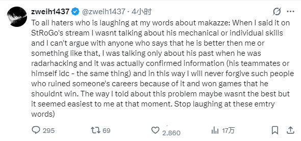 致所有嘲笑我关于makazze言论的黑子们:我在StRoGo的直播里说那番话时,并不是在说他的操作水平或个人能力——要是有人说他比我强之类的,我也没法反驳;我聊的只是他过去开雷达开外挂的事,而且这是实锤的消息(不管是他队友说的还是他自己承认的,都一样)。这种毁了别人职业生涯、靠作弊赢本该输掉的比赛的人,我永远不会原谅。可能我当时阐述这件事的方式不是最妥当的,但别再拿这些话来嘲笑我了。