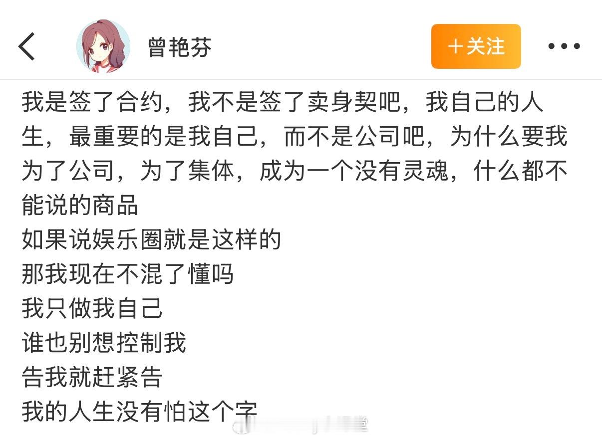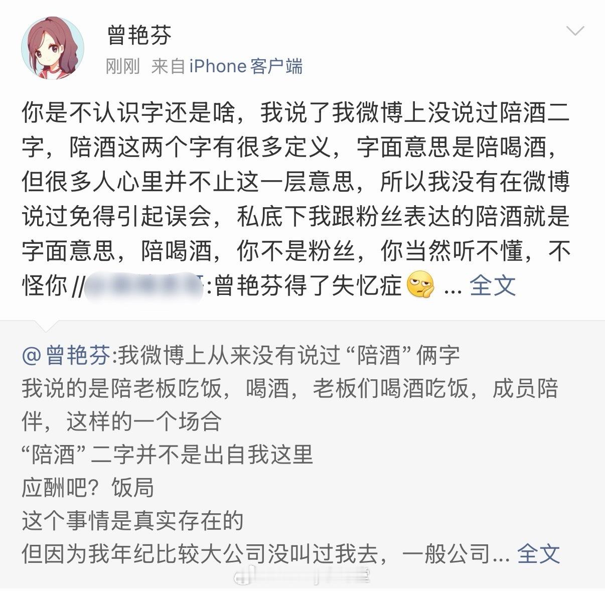 曾艳芬发文:我在微博上从来没有说过“陪酒”两字,“陪酒”二字并不是出自我这里。