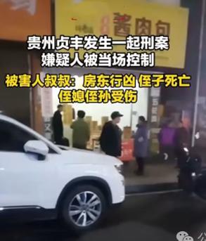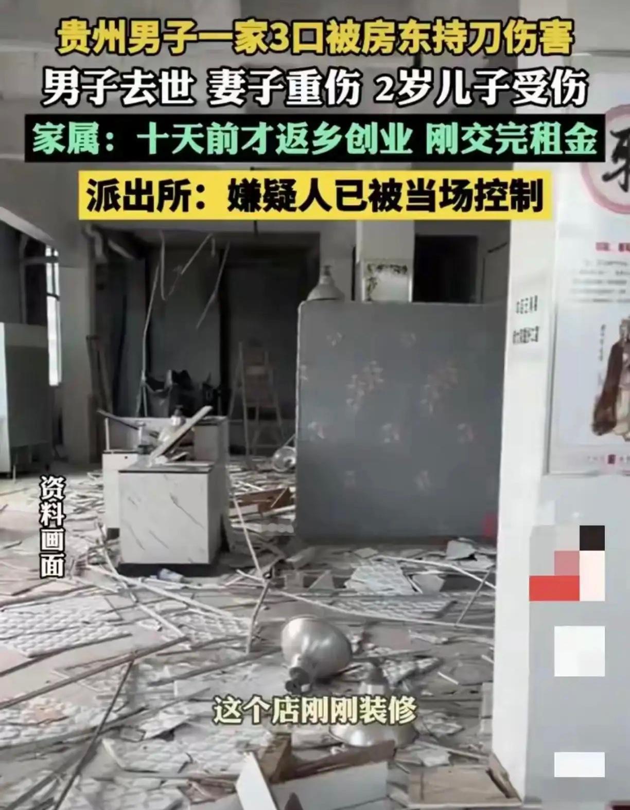贵州贞丰县1死2伤惨案细节曝光,装修噪音起冲突,暴躁房东行凶。据周围知情者透露,该房东平素对租客挑剔、小气,动不动就要找租客的麻烦,很多租客租他的门面都受一肚子气,有的宁愿押金不要都要搬走。这个从浙江回来返乡开店的一家三口,找门面找了好久,相中了这个门面,可能是第一次开店,经验不多,没有对门面的情况做综合了解,房东的人品更是一无所知。就急切签了合同,为了锁定门面,还一次性交三了年房租。因为想趁年底快点开店,就加快装修进度。却没想到,因为装修噪音的问题惹怒了在楼上居住的暴脾气的房东,爆发冲突,导致男子死亡,妻子重伤,2岁的儿子也被牵连。死者年仅37岁,一声叹息。贵州家庭悲剧 安顺暴力事件