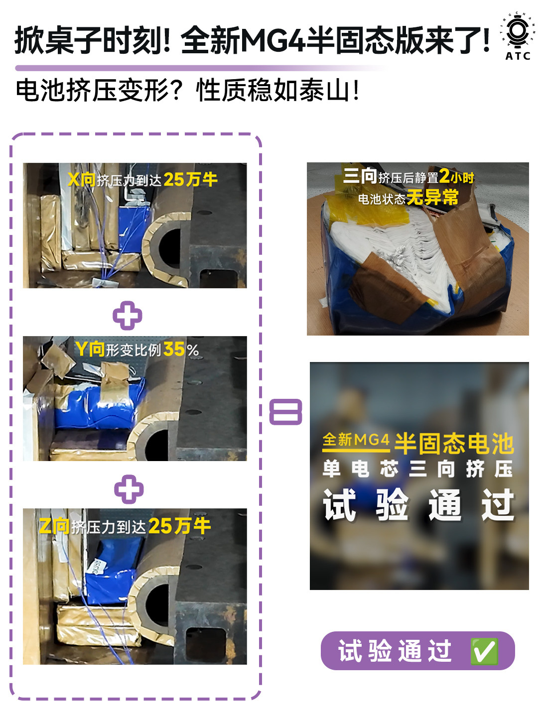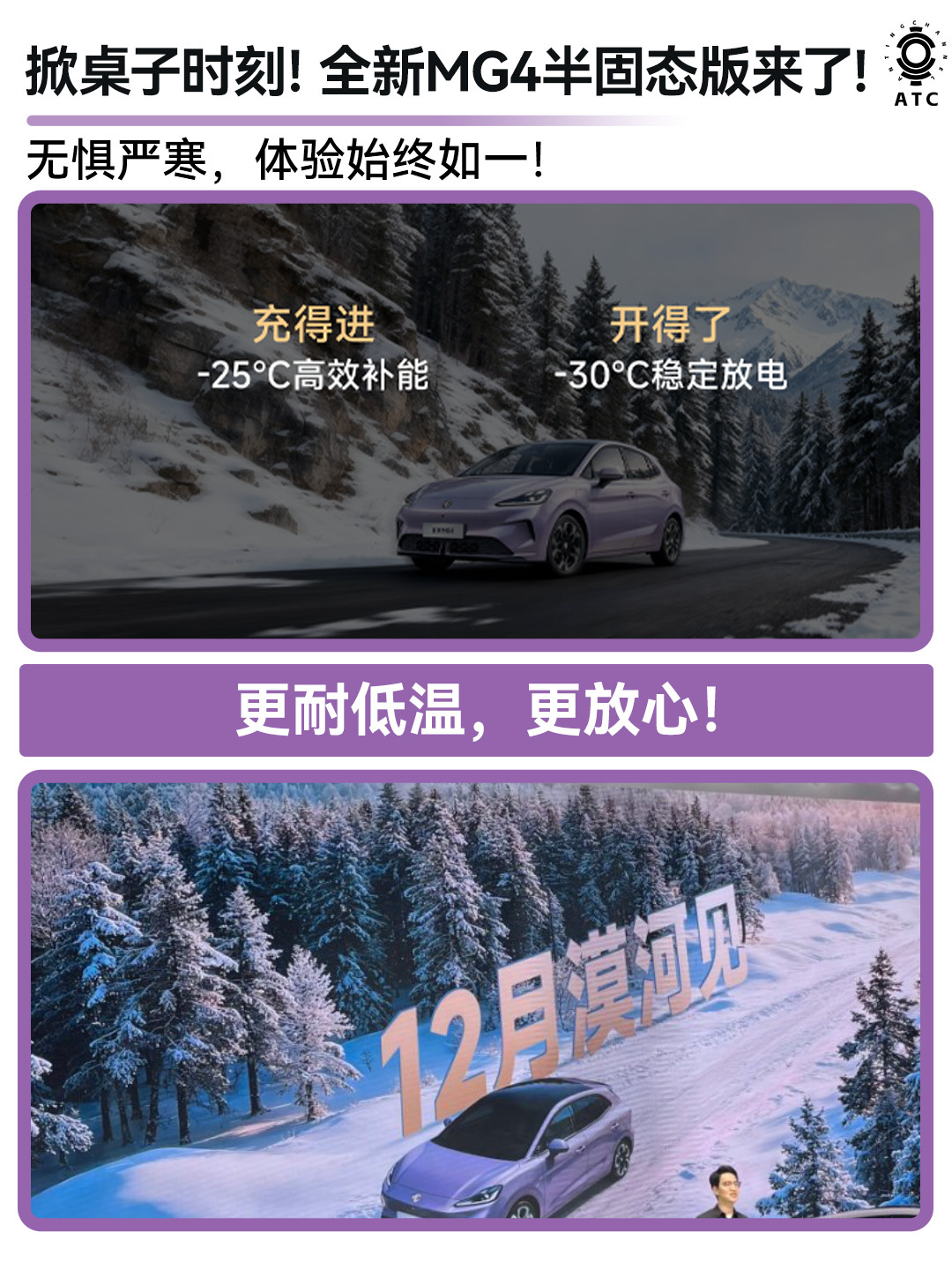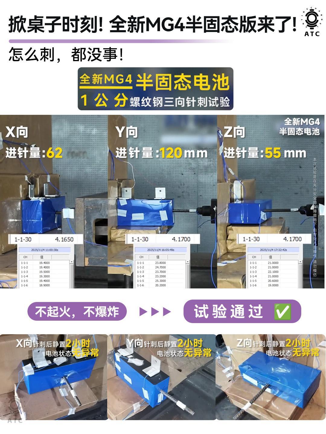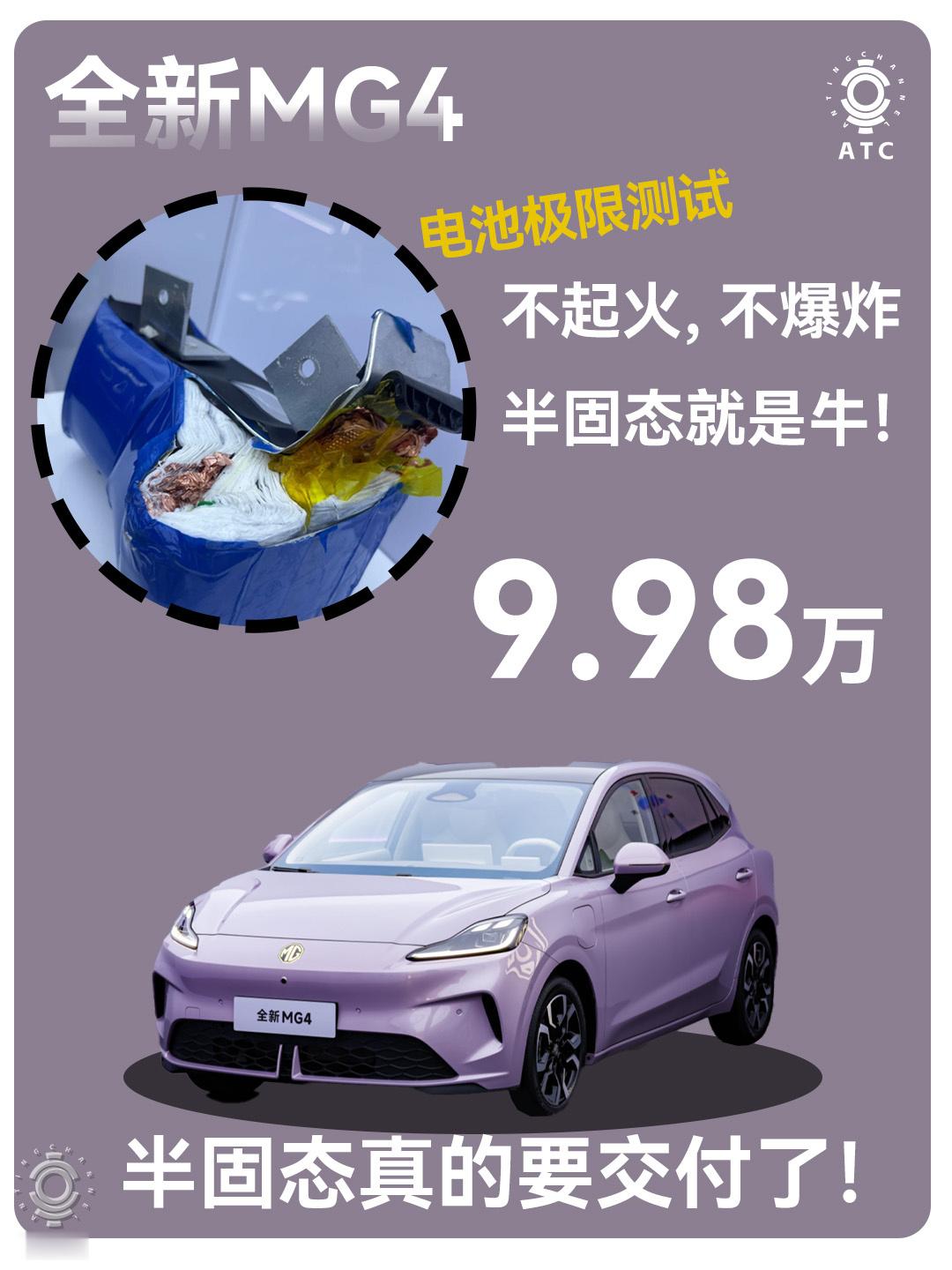 全新MG4,连续两月销量破万,口碑一路看涨,而之前在发布会上埋下的终极彩蛋——半固态版,也在这次广州车展上官宣下月交付了,9.98万的售价,我的媒体同行们都说这次真的改变行业格局了。在我看来,半固态电池的量产上车,绝非单纯的参数升级,更不是啥营销噱头,对咱们消费者来说,它的核心价值其实就俩字:实用。先聊聊现在大家都关心的电池安全,咱直接看实测数据:一公分粗的螺纹钢,从X、Y、Z三个方向对电池进行穿刺,静置2小时下来,电芯既不冒烟也不起火;在更严苛的25万牛挤压测试中,力度相当于20吨重物直接碾压,差不多是15辆家用轿车的总重,即便电芯被挤压到35%的形变量,也没出现热失控。这意味着什么?意味着即便日常开车遇到严重碰撞,电池的防护底线都远超同级水平,相当于给出行上了双保险。再来聊聊北方用户们普遍头疼的低温用车问题,电车冬天续航打折、充电慢,这确实是行业通病,但MG4半固态版这次给出了不一样的答案:即便在-30℃的极寒环境下,不用提前预热就能直接充电,动力输出也不会打折扣;想象一下,东北的冬天不用在寒风里等电池预热半天,过年返乡跑高速也不用频繁找充电桩补能。可能有人会问,这么硬核的技术,怎么卖这么亲民的价格?其实这背后正是MG对于“技术平权”的贯彻落实,通过上汽20年的技术沉淀,叠加上百亿的研发投入,打造出一支集院士、长江学者等顶尖人才的科研团队,以不到10万的价格下放给普通消费者,这也是MG4半固态版为何能成为半固态产业化走量的“破局者”的关键所在。再者,我们也能从侧面看出,作为百年历史沉淀的品牌,MG在纯电时代依旧保持着蓬勃的创新力,预示着未来半固态电池、L3智驾等前沿技术,会逐步下放至更多车型简单总结就是,如果是北方用户,或是把安全、技术体验放在首位,MG4半固态版绝对是10万级别里“闭眼冲”的选项;如果只是日常城市代步、短途通勤,530智趣版或437自由版也完全能满足日常需求,总之一句话,不同版本各有侧重,总有一款适合你。