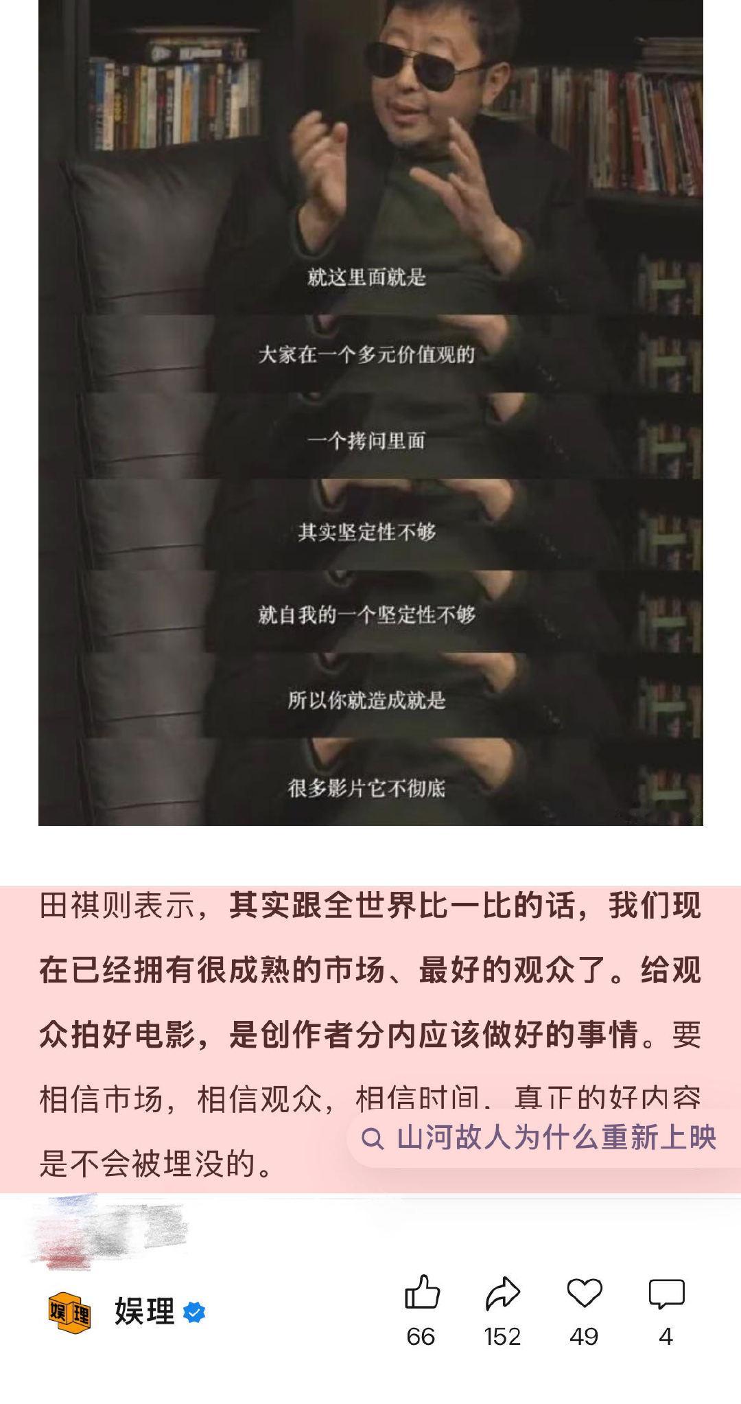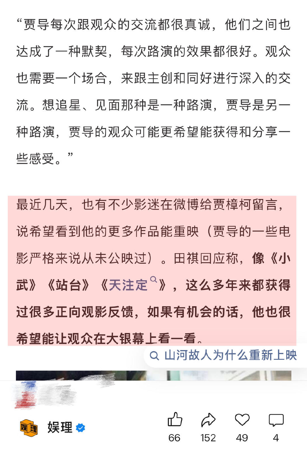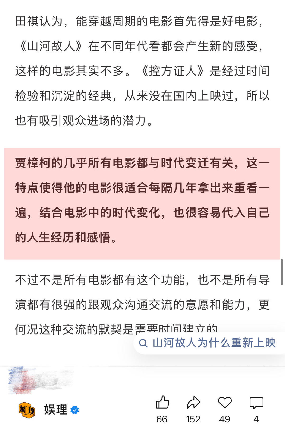 贾樟柯谈文艺片路演的意义 为什么山河故人复映能拿下500万票房 文艺向、作者向的电影票房惨淡,近两年很多入围过国际电影节、明星主演的电影票房只有几十万甚至十万出头,血本无归。《山河故人》《控方证人》这两部电影的五百万票房,虽然跟商业巨制的票房体量无法相比,但对创作者来说是一个令人鼓舞的信号,至少说明“小众精品”也是有意义的、有价值的…娱理独家↓