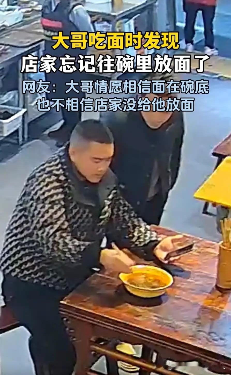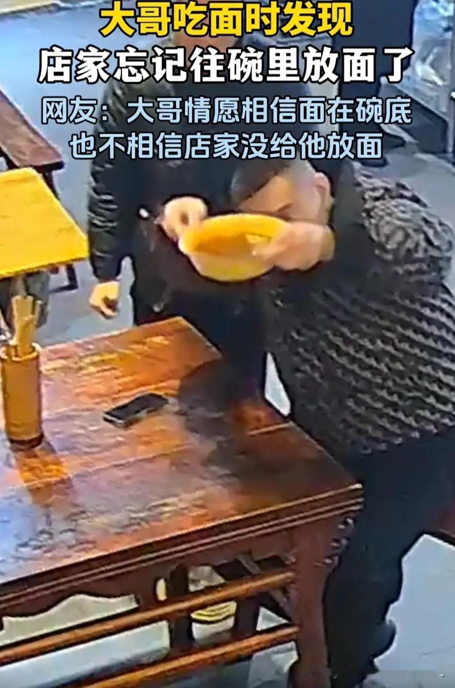 笑不活了!四川一男子去面馆点牛肉面,店家居然忘放面,直接端上一碗飘着葱花、浮着油星的浓汤。更逗的是,男子宁愿相信面沉在汤底下,也没立刻怀疑店家漏做,网友调侃:这怕不是“皇帝的新面”! 监控里,男子边玩手机边等餐,看到汤碗时愣了一下,却没喊店员。他拿起筷子,在碗里翻来搅去,目光死死盯着筷子尖,仿佛面条真藏在汤底。捞了半天啥也没有,甚至端起碗看碗底,这才无奈喊店员。 网友说面子不值钱,招牌和服务才重要。其实好笑的不是店家失误,是男子那几秒的犹豫。这反应太真实了!遇到不对劲的事,我们总先怀疑自己:是不是看错了?是不是记错了?不是怂,是习惯了相信事情该有的样子。 店家的疏忽确实得改,但男子这波操作让人会心一笑。生活里的小尴尬,往往就是这么来的,透着一股普通人的可爱劲儿。