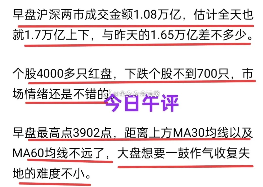 A股:今天开盘前,有朋友在评论席问,金姐答,如果涨到3900点上方,考虑高抛。尾盘的时候,场内不少高标个股跳水!沪深两市成交金额1.72万亿,比昨天略有放大,大约是700亿左右。虽然成交金额比昨天放大了,但还是属于相对较低水平。盘中最高点是3902点,这是早盘的最高点。早盘收盘3899点,最终收盘是3890点,大盘下午跌了9个点。创业板早盘最高点是3157点,最终收盘是3122点,跌了33点。早盘收盘后,金姐发现成交金额只有万亿水平。金姐感觉今天不能再好了,午评时再次提醒逢高减仓。大盘是大盘,个股是个股。今天上涨个股超过了4200只,下跌个股只有850余只,红肥绿瘦。实际上,周三的时候,渔夫讲过,市场【超跌个股反弹】已经发展为趋势。所以,市场成交量不算理想,大盘表现也不咋滴,但个股普涨。昨天收盘后,金姐讲过,如果创业板今天守住了3100点,下周还有可能再次跌破3100点。下周,一起来验证个人观点,仅供交流,不构成投资建议!理财有风险,投资需谨慎!