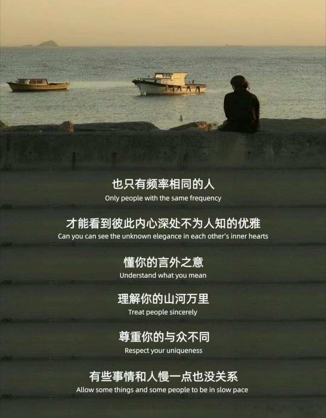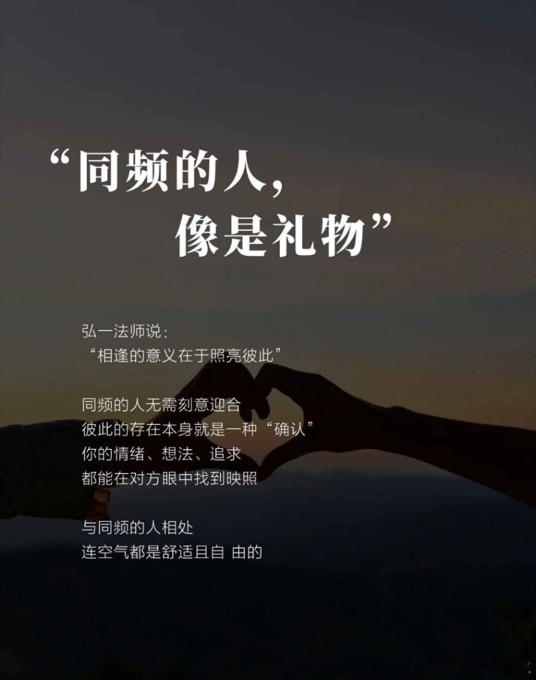 同频的人相遇就是最好的礼物 不是所有陪伴都值得珍惜,但同频的人一定是例外。彼此的存在本身就是一种确认,频率相同的人能看到和你一样的风景,能发现你内心深处不为人知的优雅,懂你的言外之意,理解你的山河万里。相处时的开心舒服,还有那股莫名的依附感,都是这份相遇带来的宝藏