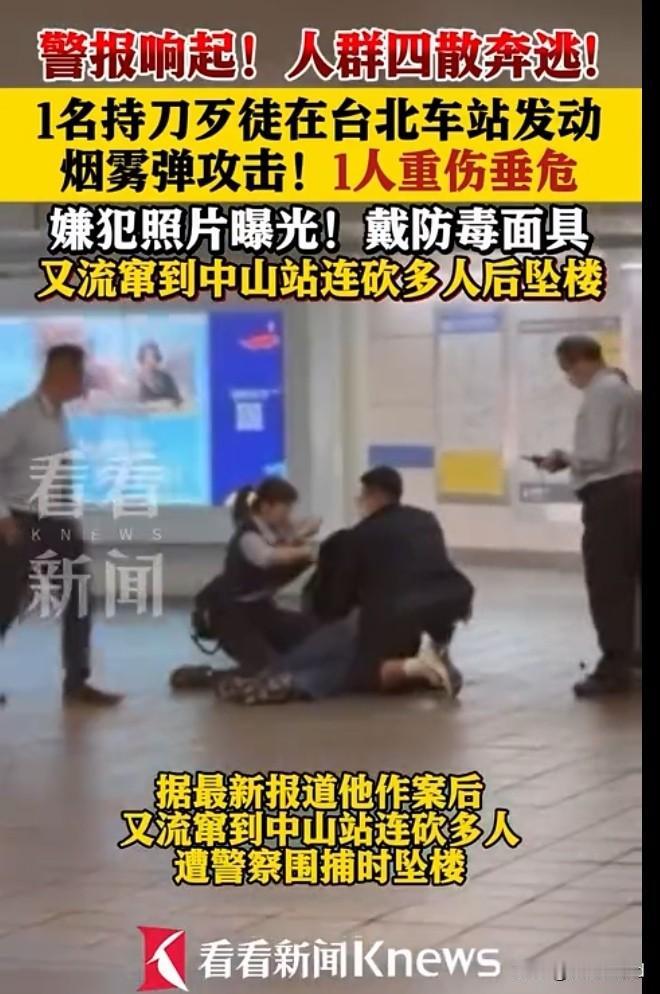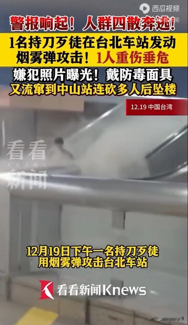 台北捷运惊现连环袭击 逃兵通缉犯酿2死7伤 台北捷运12月19日傍晚突发恶性袭击。27岁逃兵通缉犯张文戴着防毒面具,携烟雾弹汽油弹长刀搞事情。 17时20分许,台北车站M7出口人流密集处,张文突然投掷多枚烟雾弹,现场瞬间浓烟滚滚如战场迷雾。他趁机持刀捅伤一名57岁劝阻男子,对方送医后宣告不治。20分钟后,他窜至捷运中山站,沿途追砍路人,随后闯入诚品南西店。 事件累计造成9人受伤,4人病危。张文被警方包围后,从商场6楼坠楼身亡。警方在其行李箱中搜出未引爆弹药,初步判断属预谋作案。台北市长蒋万安表示,捷运已恢复运行,将全面加强警戒,任何伤害民众的行为必从重究责。嫌犯因逃避兵役被通缉,疑似挟怨报复。 这起事件实打实暴露安保短板,网络可轻易买到作案工具。张文胆大包天的行径让台北市民人心惶惶,后续是否有同伙或更深层动机仍待调查。这事儿背后还有多少隐情?
