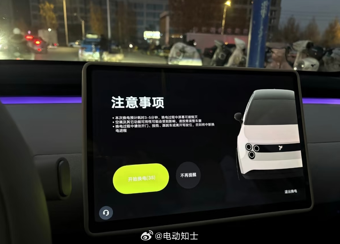 firefly萤火虫开始换电测试,按这个速度明年一季度小虫车主们就可以去五代站换电池了[皱眉] 本次换电预计耗时3—5分钟,换电过程中屏幕可能熄灭; 空调及其它功能可用性可能会受到影响,请按需调整车窗; 换电过程中请勿开门、挂挡、踩刹车或离开驾驶位,否则将中断换电进程.