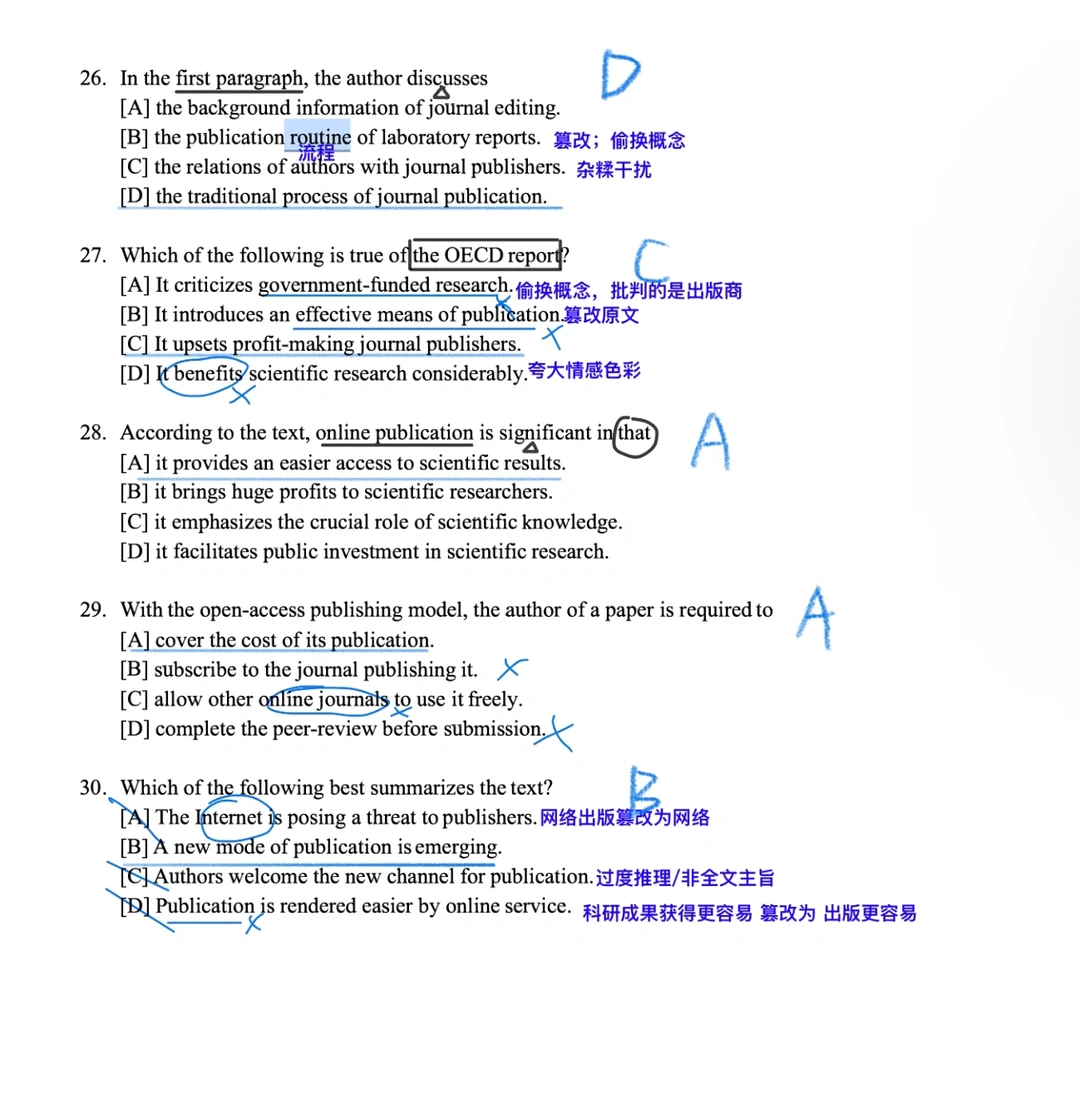 1⃣️以偏概全:命题人通常会用仅在文章某一段或者某两段中出现的细节信息来设置干扰,例如本篇的30题