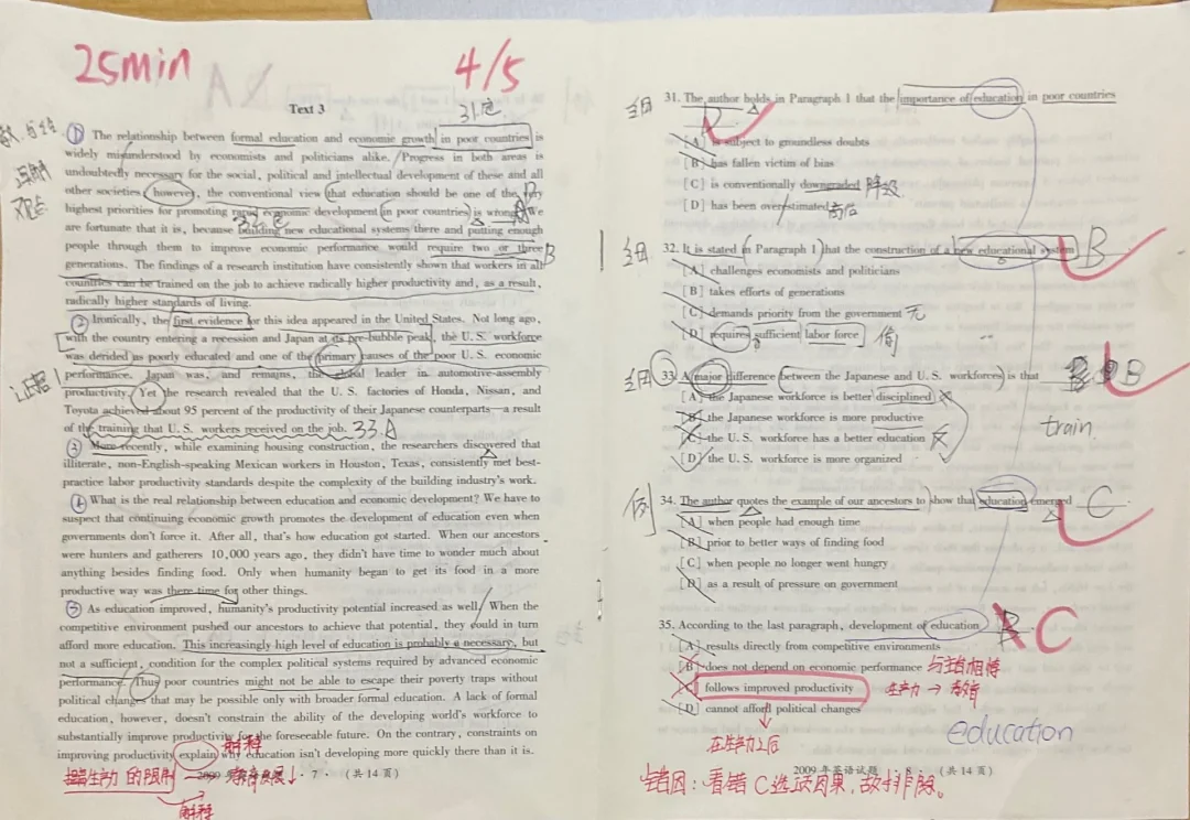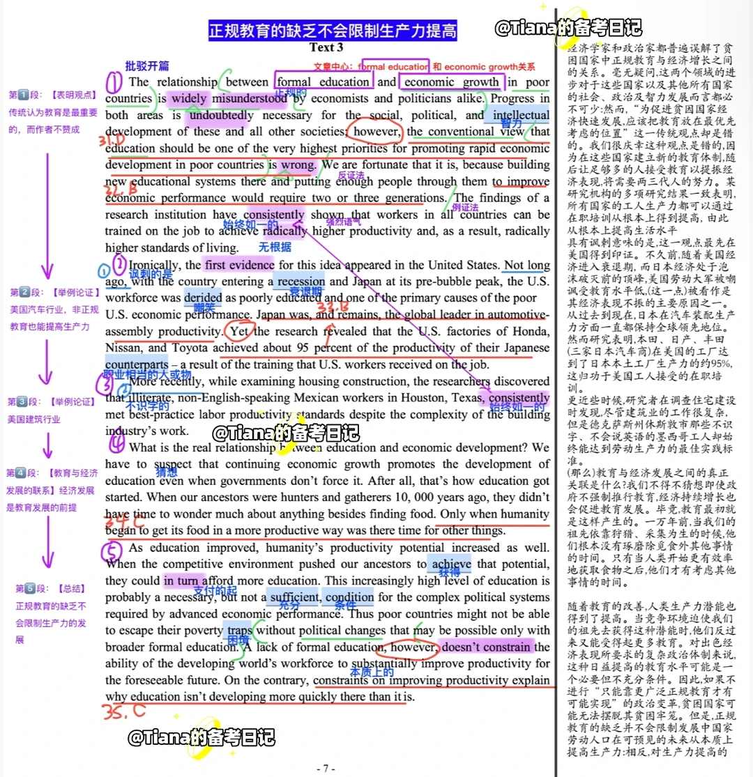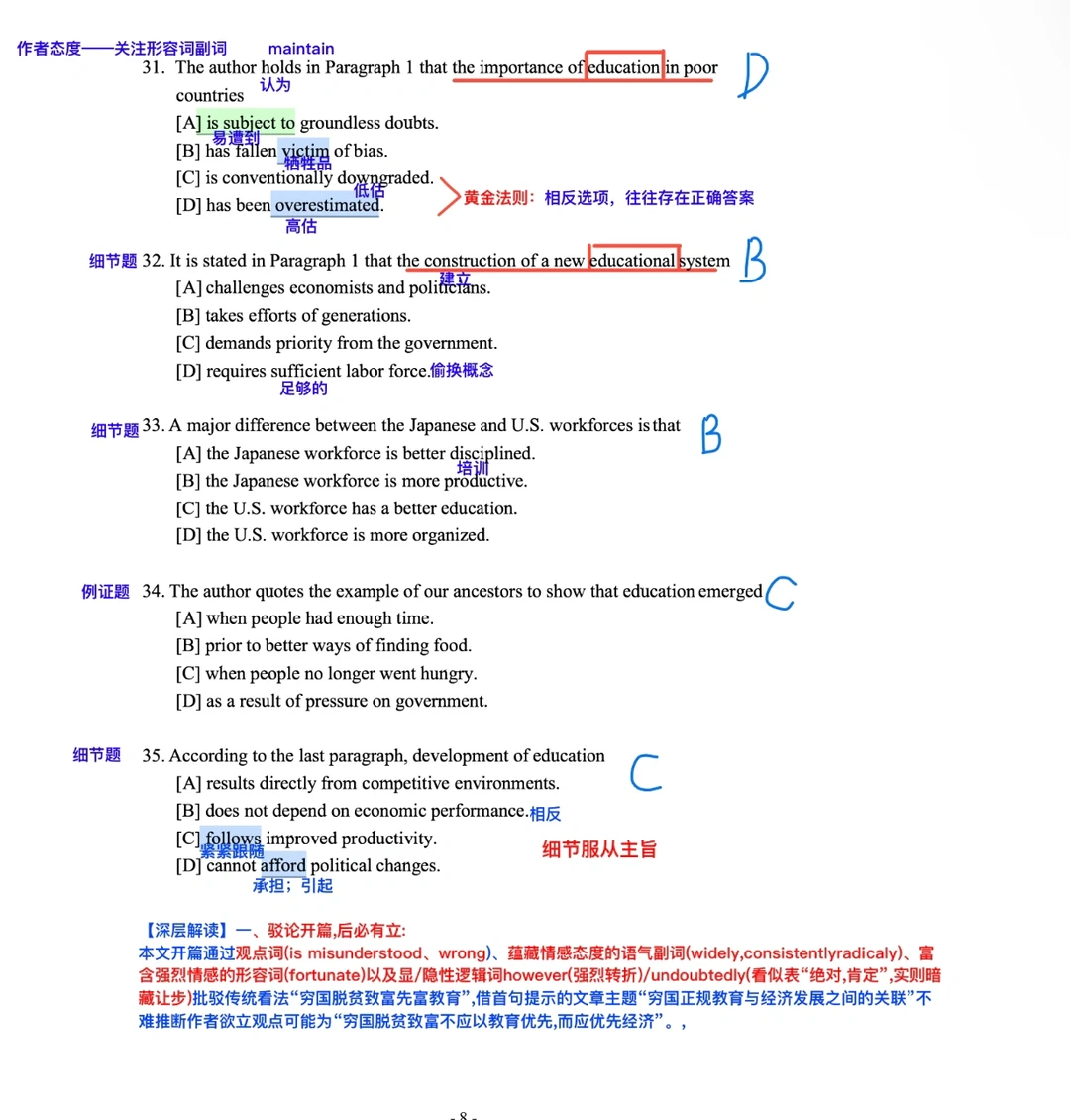 【深层解读】一、驳论开篇,后必有立:本文开篇通过观点词(is misunderstood、wrong)、蕴藏情感态度的语气副词(widely,consistentlyradicaly)、富含强烈情感的形容词(fortunate)以及显/隐性逻辑词however(强烈转折)/unbtedly(看似表“绝对,肯定”,实则暗藏让步)批驳传统看法“穷国脱贫致富先富教育”,借首句提示的文章主题“穷国正规教育与经济发展之间的关联”不难推断作者欲立观点可能为“穷国脱贫致富不应以教育优先,而应优先经济”。