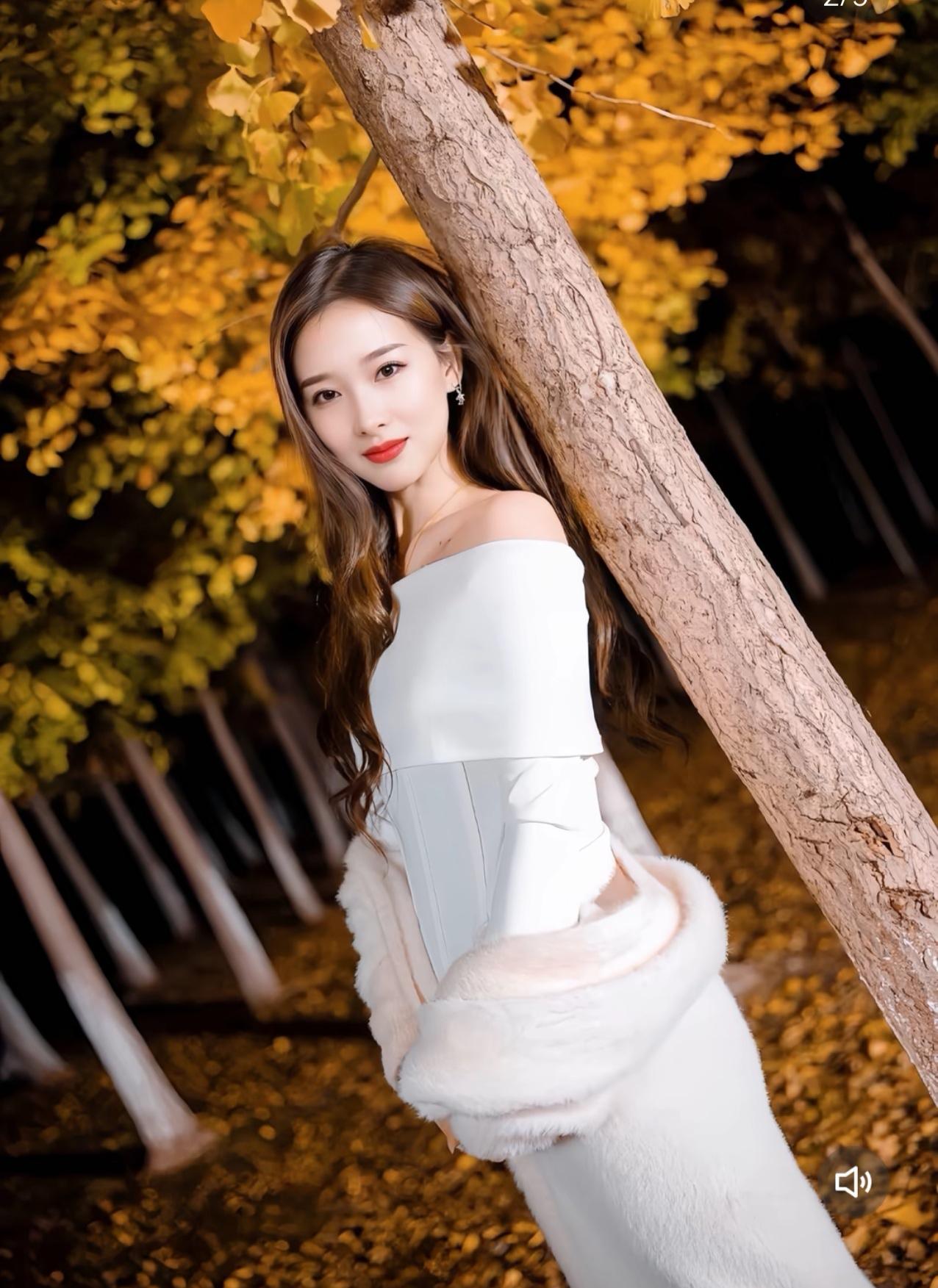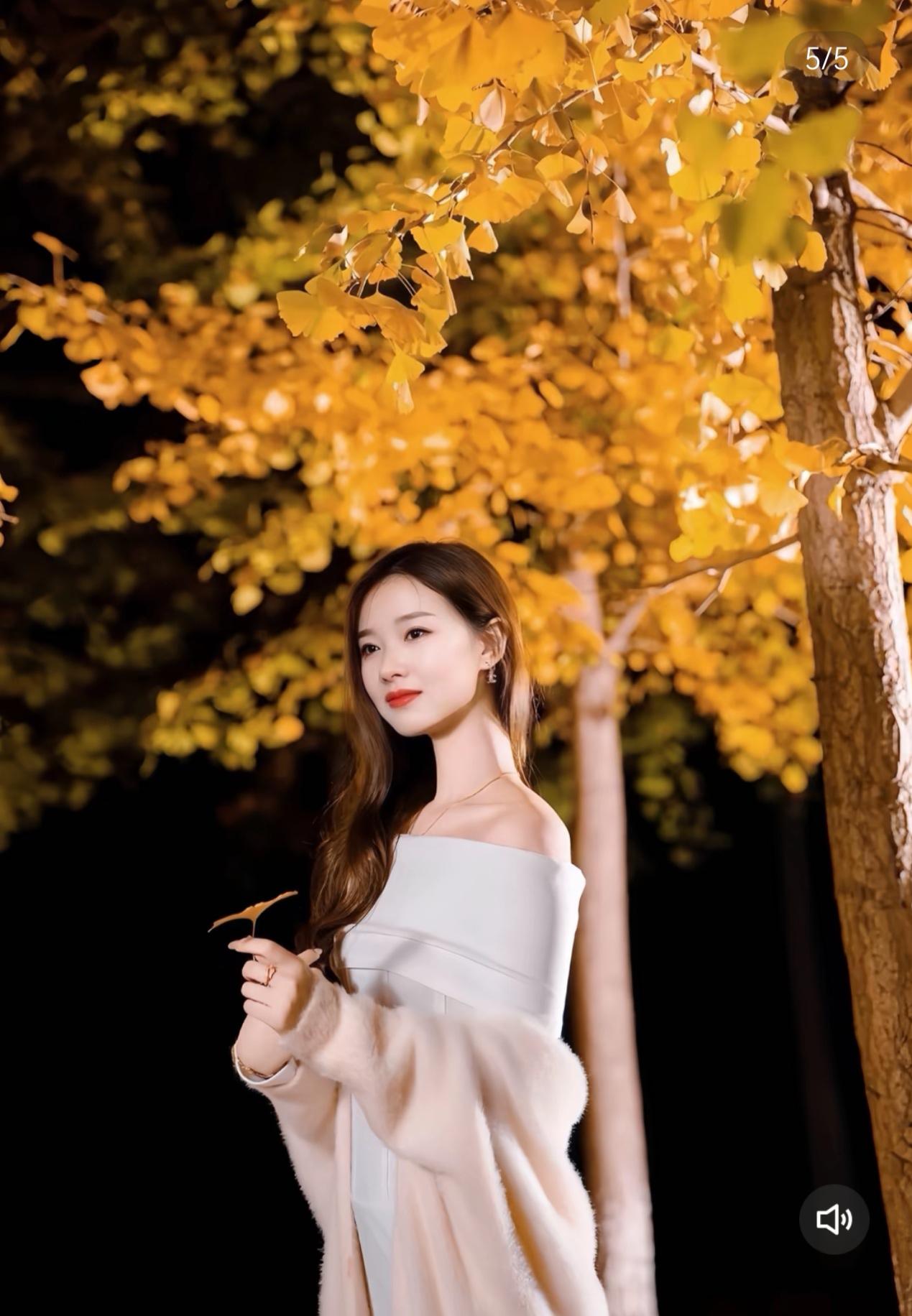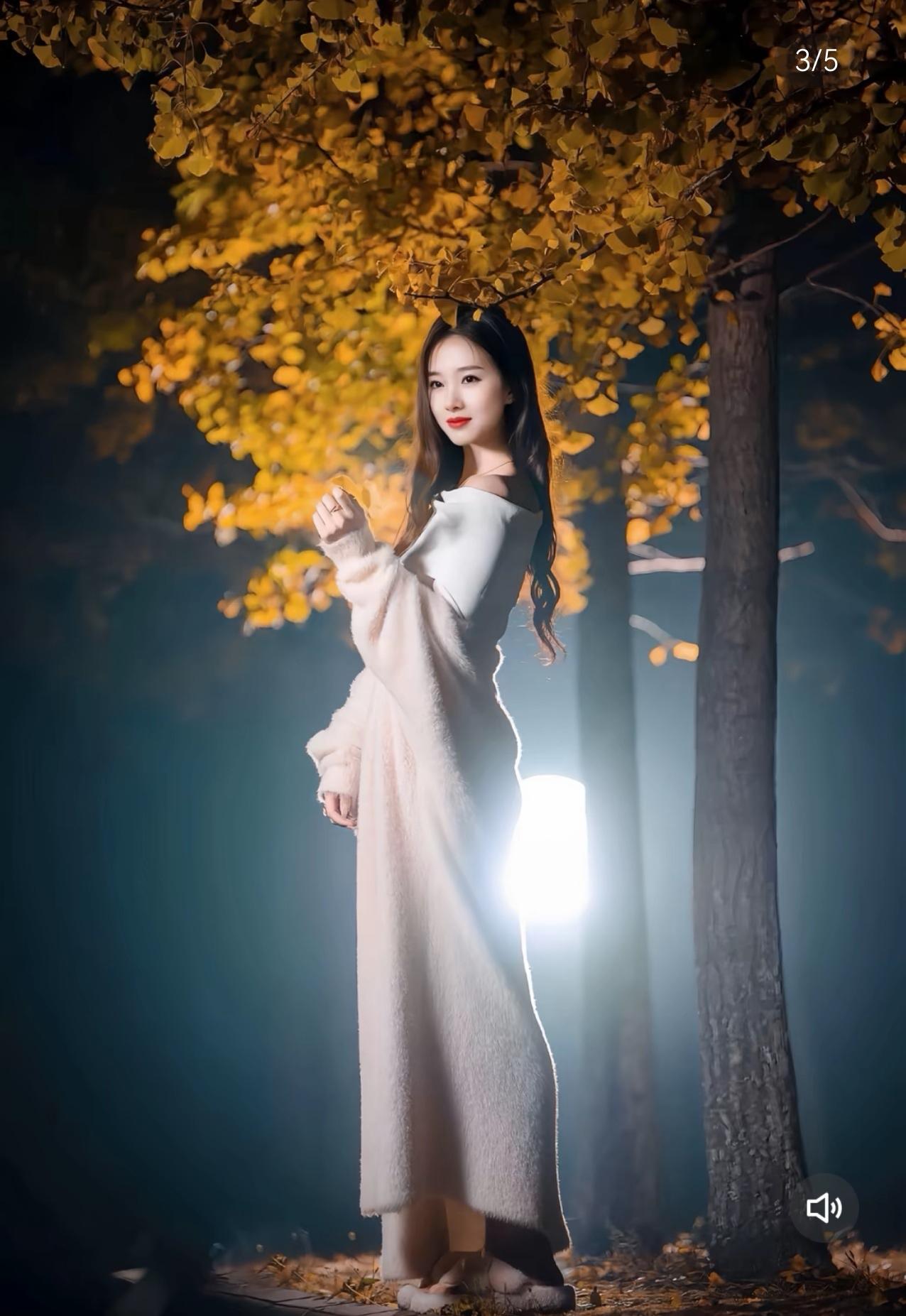 深秋的夜晚,月光如水银般倾泻在静谧的公园小径上。银杏树下,一位女子宛如从画中走来,她身着白色一字肩连衣裙,裙摆随着微风轻轻摇曳,仿佛一朵在夜色中绽放的百合。那精致的锁骨在月光下若隐若现,与颈间闪烁的银链交相辉映,更添几分优雅。 她手中轻拈一片金黄的银杏叶,叶脉在月光下清晰可见,如同大自然精心绘制的纹路。背景中的银杏树被柔和的灯光点亮,满树金黄仿佛燃烧的火焰,与她的白色长裙形成鲜明对比,却又奇妙地融为一体。夜风掠过,几片银杏叶缓缓飘落,在她周围织就一场金色的雨。 她的长发如瀑,发梢在夜风中轻舞,偶尔掠过唇边那抹嫣红,平添几分妩媚。粉色的毛绒外套随意搭在臂弯,仿佛随时准备为这微凉的秋夜增添一丝暖意。当她抬眸望向飘落的银杏叶时,眼波流转间,整个夜色都为之温柔。 这帧画面最动人的,是那份浑然天成的诗意。银杏的金、长裙的白、唇间的红,在夜色中交织成最动人的色彩。她站在时光的渡口,既保持着古典的婉约,又带着现代的灵动。那些飘落的银杏叶,像是时光写给秋天的情书,而她,就是这封情书最美的注脚。