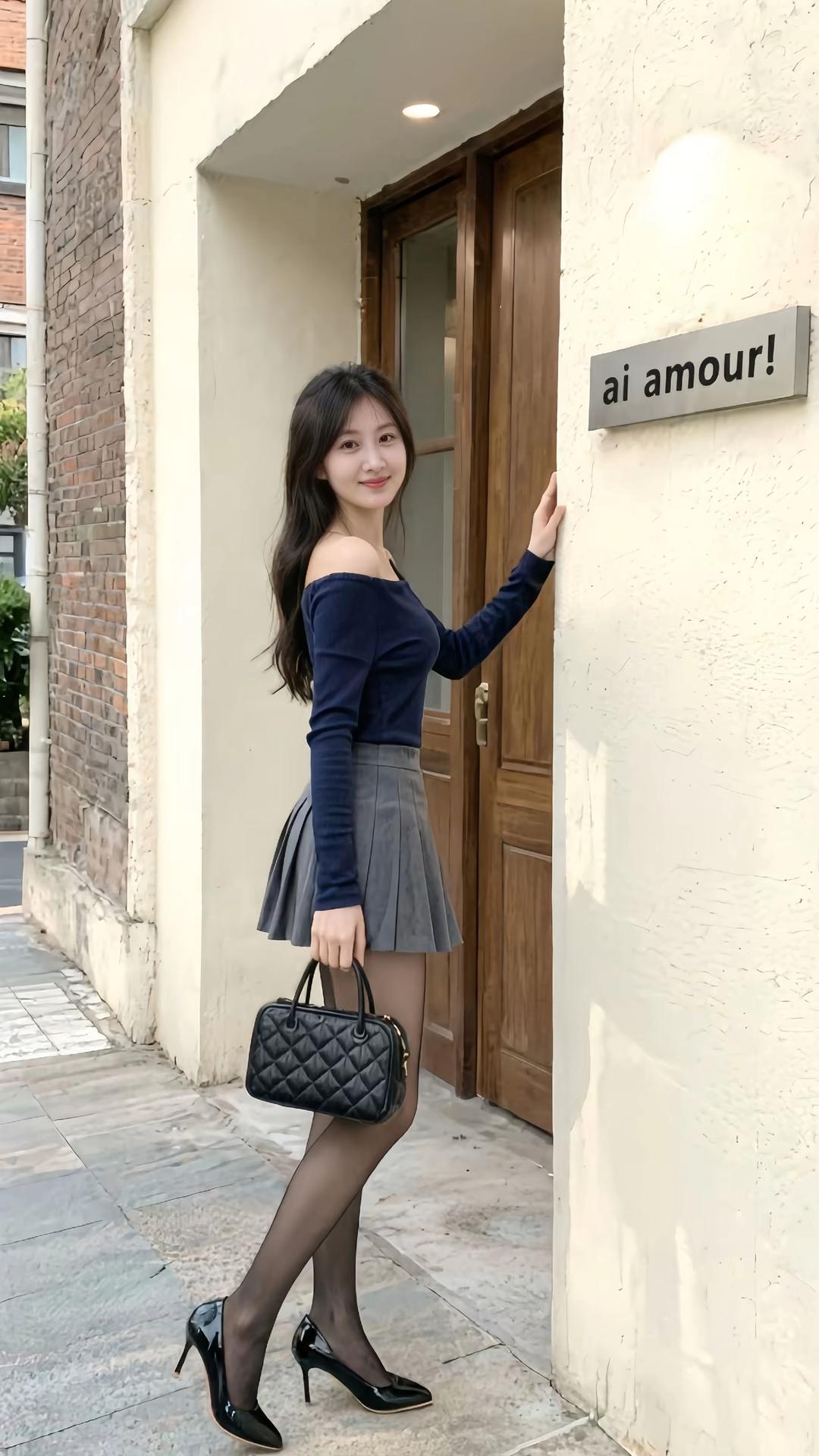 《蓝衣少女与旧时光的回响》 深秋的午后,阳光穿过梧桐叶的缝隙,在石板路上织出细碎的光斑。我站在美术馆的拱门下,看着照片里那位穿深蓝露肩上衣的姑娘,忽然想起三年前在巴黎玛黑区偶遇的那位街头画家。 那是个飘着细雨的清晨,塞纳河上浮着薄雾。我抱着速写本拐进圣路易岛的小巷时,正撞见她踮着脚尖往墙上贴海报。深蓝丝绒布料勾勒出肩颈流畅的弧线,裙摆扬起时露出丝袜上若隐若现的暗纹,像极了莫迪里阿尼笔下的忧郁女郎。 "要帮忙吗?"我捡起被风吹落的图钉。她转过头,栗色发丝间别着枚古董珐琅发卡,耳垂上的珍珠坠子随着动作轻晃。海报上"ai amour!"的烫金字体在晨光里闪烁,后来才知道那是她策划的独立艺术展主题——爱与人工智能的对话。 我们在街角咖啡馆聊了整上午。她说这件上衣是祖母的嫁妆,改款时特意保留了三粒珍珠母贝纽扣;说起小时候躲在阁楼翻祖母的时装手札,泛黄纸页间夹着1968年"五月风暴"时的传单。当话题转到她正在设计的交互装置,她掏出平板给我看概念图:用神经网络解析《小王子》里玫瑰与狐狸的对话,投影在二十米高的玻璃穹顶上。 暮色降临时,她披上驼色大衣往新桥方向走。我望着那个渐行渐远的蓝色背影,忽然明白有些美注定要消逝在时光里——就像我们永远不会知道,她最终有没有完成那个将《玫瑰人生》旋律转译成动态光影的疯狂构想。 此刻照片中的姑娘站在相似的拱门下,领口别着相同的三粒珍珠纽扣。或许每个时代都有这样的造梦者,用衣褶里藏着的旧时光,在钢筋森林里种下温柔的悖论。当她的高跟鞋叩响石板路,我仿佛听见智能机械臂绘制油画时的沙沙声,看见全息投影里飘落的电子樱花正落在她微卷的发梢。