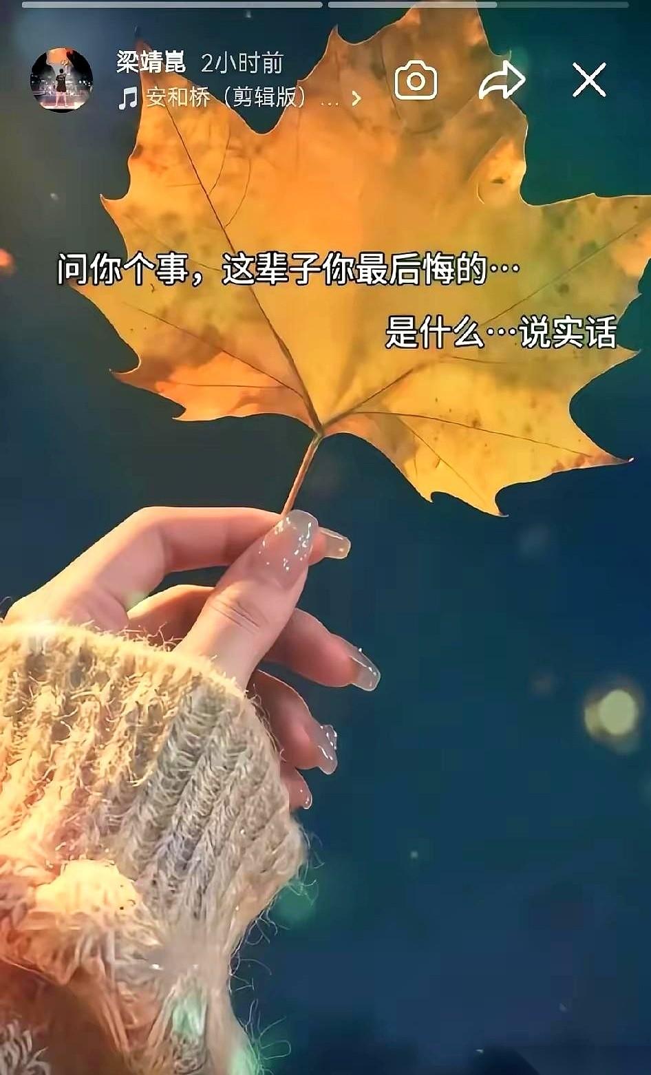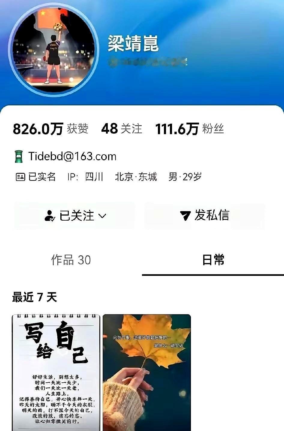 大半夜刷到梁靖崑的动态,心里咯噔一下。 就两张带字的图,没头没尾的,但那股子劲儿,一看就是心里有事,而且是摊上了特后悔、特难办的事儿。 这一下给我整不会了。 说真的,我一直觉得大胖这哥们儿,就是来人间体验生活的。家里有底子,老婆漂亮,俩儿子活蹦乱跳,世界冠军拿到手软,甚至连北影的教师编这种“铁饭碗”都端上了。 他的人生剧本,写满了“别人家的孩子”。 你说,这样的人,他还能愁啥? 可就是这深夜的一点情绪流露,突然就把他从神坛上拉下来,变成了一个活生生、有血有肉的普通人。 人啊,最怕的从来不是一无所有,而是站在拥有一切的地方,回头看,心里却有个声音在说:“我本可以”。 那种无力感,比什么都磨人。 尤其他们这种打球的,还是顶尖那拨儿的,每场输赢,每个机会,都被放在显微镜下。外人看的是奖牌和鲜花,他们自己心里揣着的,可能全是那些“差一点”的瞬间。 不知道他到底经历了什么。 但那一刻,我好像突然就懂了。成年人的世界哪有什么真正的“人生赢家”,不过都是在人前强撑,在深夜里独自消化罢了。 抱抱大胖吧。