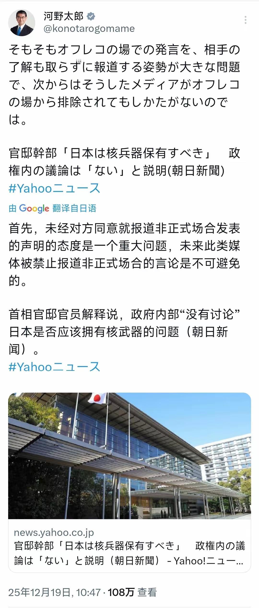 在日本首相官邸一名高级别官员表示日本需要核武器而引发国际舆论热议后,日本众议员、前日本外务大臣河野太郎12月19日解释道:“首先,未经对方同意就报道非正式场合发表的声明的态度是一个重大问题,未来此类媒体被禁止报道非正式场合的言论是不可避免的。首相官邸官员解释说,政府内部‘没有讨论’日本是否应该拥有核武器的问题。” 看到吗,未经对方同意就进行报道是重大问题,而日本想要拥核却不是!一句政府内部“没有讨论”就一带而过啦。这就是日本人的虚伪、无耻和“高超”的狡辩水平:这和把高市早苗在国会的正式答辩中发表的对中国动武威胁言论被日本人说成是“失误”,把中国的反制被说成是“反应过度”没有任何区别:正式场合是“失误”,对媒体说的则是政府内部“没有讨论”。 日本把它们的虚伪、无耻和狡辩当成寿司在吃!