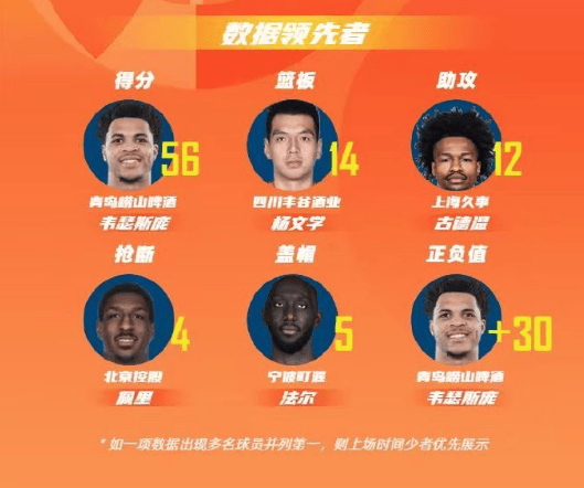 青岛男篮球员韦瑟斯庞以单场56分的数据领衔得分榜;