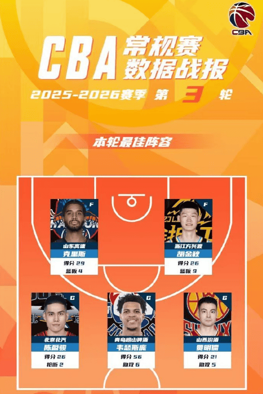 2025-2026赛季CBA联赛常规赛第3轮结束较量,来自山东男篮的克里斯,广厦男篮的胡金秋,北京男篮的陈盈骏,青岛男篮的韦瑟斯庞和山西男篮的贾明儒入选CBA联赛常规赛第3轮最佳阵容!