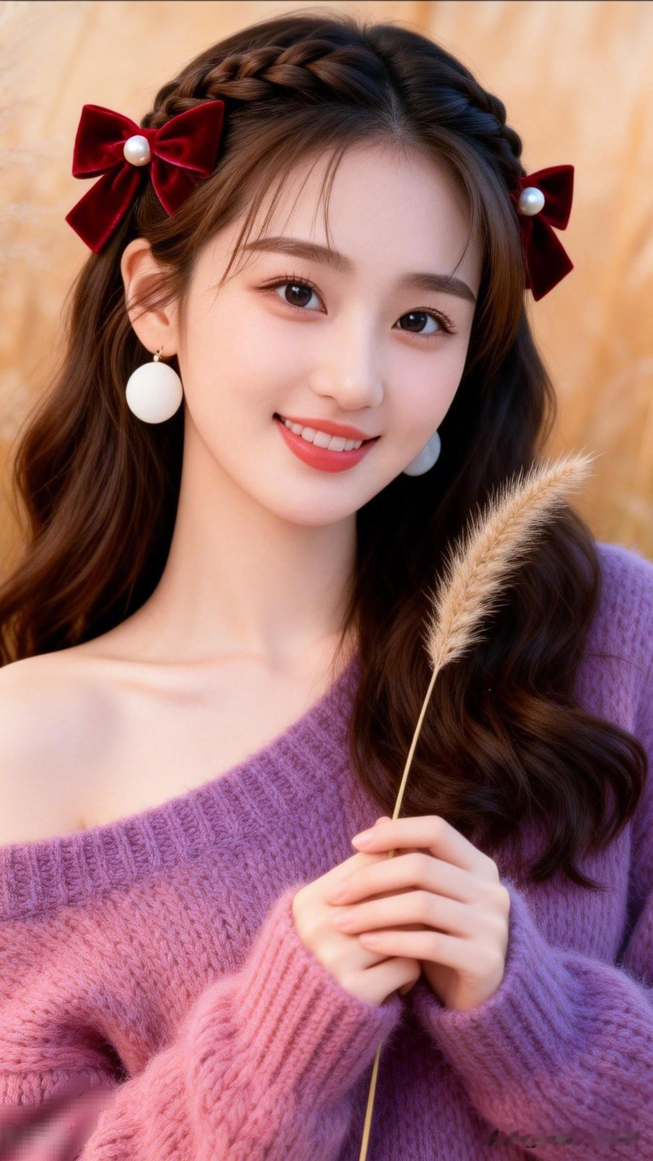 红妆美人笑,花间玉人娇。分享甜美小姐姐随手拍 温柔少女心,粉色毛衣搭配红发带,甜