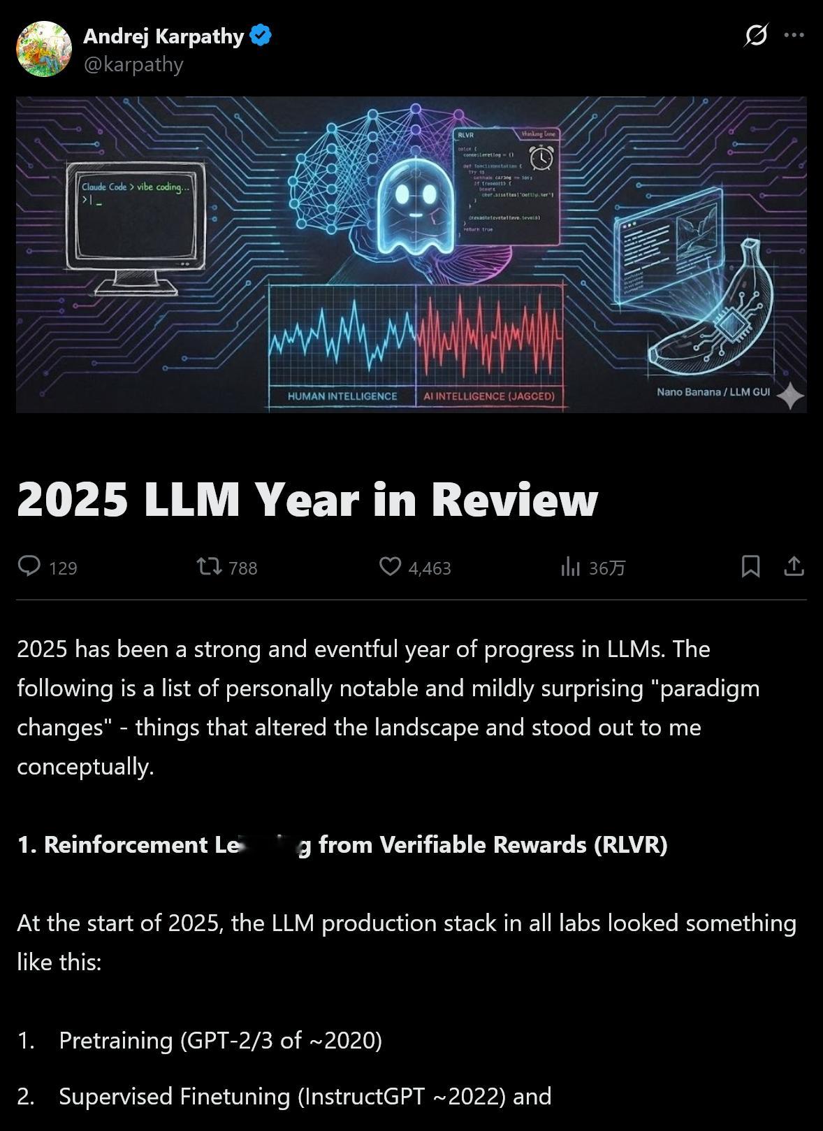 Andrej Karpathy的年度总结来啦!--------------------------------TLDR: 2025 年是 LLM 激动人心且略感惊讶的一年。LLM 正在作为一种新型智能涌现,同时比我预期的要聪明得多,也比我预期的要笨得多。无论如何,它们极其有用,而且我认为即使以目前的能力,行业也还没有实现其潜力的 10%。与此同时,有太多的想法可以尝试,从概念上讲,这个领域感觉是完全开放的。正如我今年早些时候在 Dwarkesh 播客中提到的,我同时(表面上矛盾地)相信,我们将看到快速和持续的进步,并且仍有大量工作要做。--------------------------------2025 年是 LLM 取得强劲进展且充满大事件的一年。以下是一份我也个人认为值得注意且略感惊讶的“范式转变”清单——这些是在概念上改变了格局并令我印象深刻的事物。1️⃣ 基于可验证奖励的强化学习 (RLVR)在 2025 年初,所有实验室的 LLM 生产技术栈大致如下:● 预训练 (Pretraining) (源自 ~2020 年的 GPT-2/3) ● 监督微调 (Supervised Finetuning) (源自 ~2022 年的 InstructGPT) 以及 ● 基于人类反馈的强化学习 (RLHF) (源自 ~2022 年)这在很长一段时间内是训练生产级 LLM 的稳定且行之有效的配方。到了 2025 年,基于可验证奖励的强化学习 (RLVR) 实际上成为了加入这一组合的新的主要阶段。通过在多个环境中针对可自动验证的奖励(例如数学/代码谜题)训练 LLM,模型自发地发展出了在人类看来像是“推理”的策略——它们学会了将解决问题的过程分解为中间计算步骤,并学会了许多用于反复推敲以弄清问题的解题策略(参见 DeepSeek R1 论文中的例子)。这些策略在以前的范式中很难实现,因为对于 LLM 来说,最佳的推理轨迹和纠错过程是什么样的并不清楚——它必须通过针对奖励的优化,自己去发现什么对它是有效的。与相对较“薄”/较短的 SFT 和 RLHF 阶段(计算上属于轻微的微调)不同,RLVR 涉及针对客观(不可被博弈/钻空子)的奖励函数进行训练,这允许进行更长时间的优化。事实证明,运行 RLVR 提供了极高的“能力/美元”性价比,它吞噬了原本计划用于预训练的算力。因此,2025 年的大部分能力进展都是由 LLM 实验室消化这一新阶段的红利所定义的,总体而言,我们看到了体量相似的 LLM,但 RL 运行的时间要长得多。同样作为这一新阶段的独特之处,我们获得了一个全新的旋钮(以及相关的缩放定律/Scaling Law),即通过生成更长的推理轨迹和增加“思考时间”,将能力作为测试时计算量 (test time compute) 的函数来控制。OpenAI o1 (2024 年末) 是 RLVR 模型的首个演示,但 o3 的发布 (2025 年初) 是明显的拐点,在那时你可以直观地感受到差异。2️⃣ 幽灵 vs. 动物 / 参差不齐的智能 (Jagged Intelligence)2025 年是我(我想整个行业也是)第一次开始更直观地内化 LLM 智能的“形状”。我们不是在“进化/培育动物”,我们是在“召唤幽灵”。关于 LLM 技术栈的一切都是不同的(神经架构、训练数据、训练算法,尤其是优化压力),所以毫不奇怪,我们在智能空间中得到的是完全不同的实体,用动物的视角去思考它们是不恰当的。从监督的比特位来看,人类神经网络是为了在丛林部落中的生存而优化的,但 LLM 神经网络是为了模仿人类文本、在数学谜题中收集奖励以及在 LM Arena(大模型竞技场)上获得人类的点赞而优化的。由于可验证领域允许 RLVR 的存在,LLM 在这些领域附近的能力会“突刺”般激增,总体上表现出有趣的参差不齐 (jagged) 的性能特征——它们同时是天才博学家,又是困惑且认知受损的小学生,而且随时可能被“越狱”手段欺骗从而窃取你的数据。(图1 : 关于图片的注释:人类智能是蓝色的,AI 智能是红色的。我喜欢这个版本的梗图,它指出了人类智能也以其独特的不同方式呈现出参差不齐的状态。)与此相关的是我在 2025 年对基准测试 (Benchmarks) 普遍产生的冷漠和信任缺失。核心问题在于,基准测试几乎在构建上就是可验证的环境,因此立即容易受到 RLVR 以及通过合成数据生成进行的较弱形式 RLVR 的影响。在典型的“刷榜 (benchmaxxing)”过程中,LLM 实验室的团队不可避免地会构建邻近基准测试所占据的嵌入空间小口袋的环境,并“长出锯齿”来覆盖它们。在测试集上训练已成为一种新的艺术形式。粉碎了所有基准测试却仍未实现 AGI (通用人工智能) 是什么样子的?我在以下文章中对本节的主题写了更多内容:● Animals vs. Ghosts (动物与幽灵) karpathy.bearblog.dev/animals-vs-ghosts/● Verifiability (可验证性) karpathy.bearblog.dev/verifiability/● The Space of Minds (思维空间) karpathy.bearblog.dev/the-space-of-minds3️⃣ Cursor / LLM 应用的新层级关于 Cursor(除了它今年陨石般的崛起之外),我觉得最值得注意的是它令人信服地揭示了“LLM 应用”的一个新层级——人们开始谈论“X 领域的 Cursor”。正如我在今年的 Y Combinator 演讲中所强调的,像 Cursor 这样的 LLM 应用为特定垂直领域打包并编排 LLM 调用:● 它们进行“上下文工程” ● 它们在后台编排多个 LLM 调用,将其串联成日益复杂的 DAG(有向无环图),并仔细平衡性能和成本的权衡。 ● 它们为参与循环的人类提供特定于应用程序的 GUI(图形用户界面) ● 它们提供一个“自主性滑块”2025 年有很多关于这个新应用层到底有多“厚”的讨论。LLM 实验室会捕获所有应用,还是说 LLM 应用仍有广阔天地?就我个人而言,我怀疑 LLM 实验室将倾向于培养通用的“大学生”,但 LLM 应用将通过提供私有数