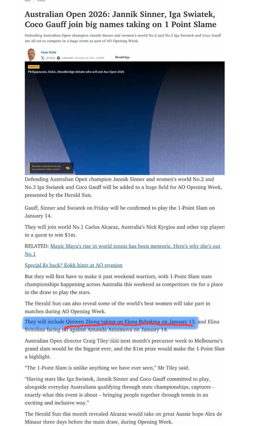澳大利亚知名媒体报道:郑钦文将在澳网赛前的1月13日和莱巴金娜打一场热身赛。 据悉,这个媒体在澳洲是非常有名的,可信度可以说是100%。 这样看来,郑钦文将确定参加澳网的比赛,而她赛前的热身也就这么一场表演赛,可以说是空降澳网。因为,此前有报道,郑钦文没有参加澳网之前布里斯班和阿德莱德的比赛。 一上来就让最受欢迎的郑钦文碰上赛季赛季末状态火热的莱巴金娜,wta为了流量也是拼了。就让我们看看郑钦文的状态能恢复到几成!