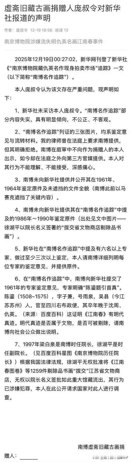 1997年5月那桩文物划拨案的6位当事人,如今已悉数离世。只剩82岁的徐湖平,带着一身病痛,说自己近20年不过问外界事。 可当年那些白纸黑字的签名,那些说不清道不明的关联,真能随着时间淡去吗?徐湖平的履历,像串环环相扣的链条。 1985年起任南京博物院副院长,1995年升常务副院长,还是南博法人;2001年接院长职,直到2005年卸任。 更耐人寻味的是,他同时握着江东省文物总店的法人代表印。说白了,南博和省文物总店,不过是一套人马、两块招牌,锅里碗里都是他说了算。 1997年那次划拨,正是他任常务副院长期间。一批被定性为“伪作”的东西,经他签字,转到了文物总店。 4年后的2001年4月16日,《江南春》以6800元被人买走。那时,徐湖平刚当院长3个月,头上还顶着文物总店法人代表的头衔。 面对追问,他说“没经我手,我不是书画鉴定家”。这话听着轻飘飘,却经不住细想。划拨时领导栏签的是你的名,卖出时你是两头的当家人,难不成那签名是别人代笔? “经手”二字,难道要亲手递东西才算数?从1985到2005,整整20年,他在南博从副到正,全程在场。偏偏这20年里,大量文物以“伪作”之名被划走。 如今老了,一句“不了解情况”就想翻篇?天底下哪有这样的道理?文物这东西,千百年都能扛过来,人能老得过它? 那些被当作“伪作”流出去的物件,或许正躺在某个角落,等着被重新认出。可当年的经手人,却想靠“老了”“病了”躲过去。 时间从来不是遮羞布,更不是免罪牌。就像老话说的,“纸包不住火”,当年的笔锋有多用力,如今的痕迹就有多清晰。 南博和文物总店的“一家人”关系,本是为了方便管理,却在他手上成了说不清的糊涂账。既是裁判又是运动员,左手划给右手,最后流向市场,这中间的空子,谁来盯? 老百姓信任博物院,是信它能护着老祖宗的东西,不是让它成了某些人的“自留地”。徐湖平说自己不是鉴定家,可身为院长,难道不该对院里的东西负责? 鉴定错了可能是水平问题,可明明签了字,却不认账,这就不是水平的事了。就像掌柜的在账本上画了押,回头说“我不知道这账”,谁会信? 20年的时间,足够让青丝变白发,也足够让一件“伪作”被证成真品。那些年被划走的,到底有多少是真宝贝?没人说得清。 但可以肯定的是,只要签名还在,职务还在,就脱不了干系。总不能说,当了20年家,家里少了东西,掌柜的能拍胸脯说“我不知道”? 文物是国家的家底,不是谁想划走就能划走的。当年的6位当事人走了,徐湖平成了活的见证。他或许真的老了,病了,但有些事,老了也得说清楚。 就像老祖宗留下的规矩,欠的账,总得还。时间能磨平石碑上的字,却磨不掉人心的秤。老百姓心里都有杆秤,称得出谁在尽责,谁在敷衍。 徐湖平说“不过问外界事”,可外界不会忘了那些流失的文物。它们或许在等待一个答案,一个迟来的、负责任的答案。 人这一辈子,能碰上多少关乎文物的大事?徐湖平在南博的20年,本该是护宝的20年。可如今看来,却留下一堆谜团。但愿他在有生之年,能明白一个道理:有些事,躲不过去。 与其让后人猜来猜去,不如坦然面对。毕竟,文物会说话,时间会作证,谁也糊弄不了。那些被当作“伪作”的物件,或许正看着我们。 它们看过千百年的风雨,也看得清人心的真伪。希望有一天,它们能被好好对待,而不是成为某些人“说不清”的注脚。这不仅是对文物负责,更是对历史负责。
