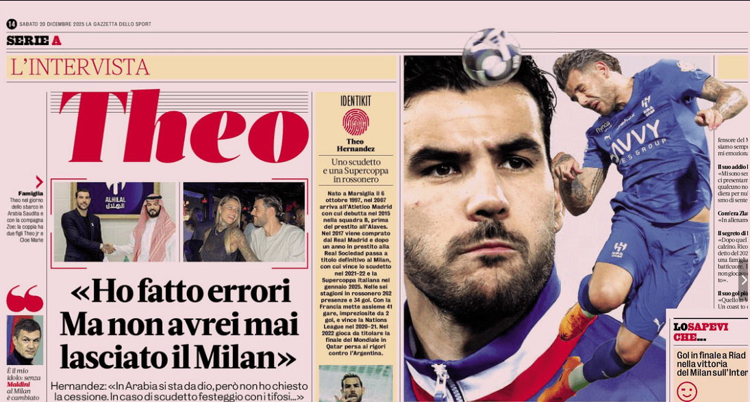 虎扑12月20日讯目前效力于利雅得新月的法国左后卫特奥-埃尔南德斯接受了《米兰体育报》的独家专访,并且谈到了效力米兰的经历,以下为专访第一部分。