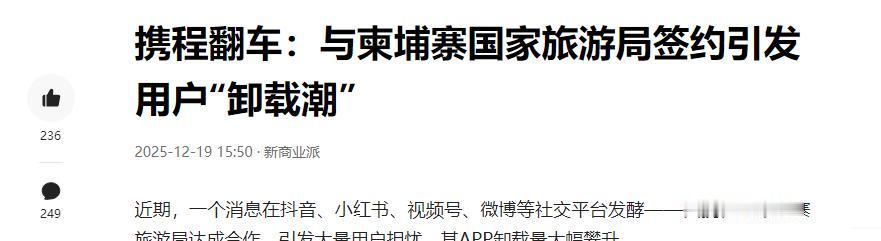 蠢得突破下限,坏得毫无底线!携程放着合规市场不做,偏偏往柬埔寨的火坑里跳,高调签约推广旅游,转头就被用户用注销账号投票! 12月1日,携程在上海搞得风风火火,官宣和柬埔寨国家旅游局达成合作,满脑子都是“东南亚旅游复苏”的流量故事,仿佛只要签了约,就能躺着收割一波出境游红利。 可它大概是眼睛长在了头顶上,完全没看见中国驻柬埔寨使馆那段时间密集发布的安全提醒,更没把普通游客的身家性命放在眼里,结果刚把合作的横幅拉起来,就被用户用注销账号的实际行动狠狠打了脸。 携程会这么孤注一掷,说白了就是被第三季度的业绩冲昏了头。根据它不久前公布的财务数据,2025年第三季度国际业务增长得相当亮眼,国际OTA平台总预订同比涨了60%,出境酒店和机票预订都冲到了2019年同期的140%,净利润更是高达199亿元。看着东南亚旅游市场6140万人次的上半年游客量和32%的增幅,携程急着想要分一杯羹,可它偏偏挑错了地方,放着新加坡、马来西亚这些安全得分稳居东南亚前列的合规市场不做,非要往柬埔寨这个公认的风险区里钻。 要知道,南方防务智库的报告早就说得明明白白,东南亚旅行安全水平参差不齐,柬埔寨的安全总分远低于大洋洲和东北亚,也就比南亚强一点,这样的地方怎么配得上携程口中“把握复苏契机”的说法。 更让人无法理解的是,携程签约的时候,柬泰边境的局势已经严峻到了使馆反复预警的程度。早在7月,柬泰边境就爆发了持续五天的大规模冲突,双方交火造成上百人伤亡,超过10万民众被迫疏散,联合国安理会都为此召开了紧急闭门会议。到了12月8日,使馆再次发文提醒,柏威夏省、奥多棉吉省这些柬泰边境地区又爆发冲突,造成人员伤亡,要求中国公民避免前往。 仅仅过了八天,12月16日使馆又一次紧急喊话,暹粒省斯雷斯南县难民营附近已经被战火波及,催促边境地区的中国公民尽快转移。短短五个月里,类似的安全提醒就发布了不下8次,几乎是按月更新的“避险指南”,携程作为一家深耕旅游行业的大公司,不可能看不到这些官方信息,可它就是选择性失明,一门心思只想着签合作、冲业绩。 柬埔寨的安全风险从来都不是空穴来风,而是有太多真实案例在反复预警。2023年10月,38岁的中国女子胡春晓在金边市开的中国小超市里被人绑架,至今下落不明。监控录像记录下了全过程,两名男子一胖一瘦,一个头戴鸭舌帽,一个戴着口罩,分工明确地挟持了胡春晓,翻走了收银台的现金、两部手机和保险箱,还冒充她给店员和家人发假消息拖延时间,转走了她银行账户里的5400美元。 家属跑到柬埔寨调查十几天,只找回了一个空保险箱和作废的旧护照,至今只能悬赏20万寻求线索。2024年7月,湖南两名未满16岁的少年,更是被网上的高薪招聘骗到柬埔寨,万幸的是经过中国驻柬使馆指导和多方协作,最终被成功解救回国。 还有2022年缅泰边境冲突时,30多名中国公民因为没及时撤离,滞留在冲突区域断水断粮两天才被救出,这些血淋淋的案例都在告诉大家柬埔寨的安全隐患有多严重,可携程就是视而不见。 对于经常出境的游客来说,“中国领事”APP早就成了必备的保命工具,截至2024年10月,它已经为150万海外公民提供过领事保护,其中近三成都是边境冲突、自然灾害这类突发情况的紧急协助。可即便是有这样的保障,大家也不想平白无故去冒险。 携程大概是觉得用户都忘了它的信息泄露前科,完全没考虑到用户的深层担忧:一旦通过携程预订柬埔寨旅游,个人信息会不会流入当地不法分子手中?毕竟柬埔寨西哈努克省直到2024年底还在打击网络赌博和电信诈骗窝点,遣返了2000多名非法人员,这样的环境下,用户的信息安全根本无从谈起。 用户的愤怒最终都转化成了注销账号的实际行动,这场抗议很快就在社交平台发酵开来。小红书、抖音、微博上全是用户晒出的携程注销截图,就连钻石级别的高等级用户都选择了卸载,“携程注销账号”的话题不到24小时讨论量就突破了500万,第三方数据显示,12月2日当天携程的账号注销申请量比平时暴涨了300%。 很多用户注销时都留下了留言,直言“不想被携程送进火坑”“安全都保障不了,还做什么旅游”。这场注销潮的影响甚至超出了国内,《联合日报》《星岛头条》等东南亚媒体都纷纷报道,让携程想要打造的“国际旅游生态”形象碎得彻彻底底。 柬埔寨政府虽然也说要加强安全治理,比如西哈努克省安装了533台监控摄像头,覆盖人流密集场所和高风险区域,但这根本解决不了本质问题。 边境冲突的死结没解开,跨国犯罪的土壤依然存在,仅凭这些表面功夫,根本无法打消游客的顾虑。携程放着好好的合规市场不开发,非要冒着损害用户信任的风险去推广高风险目的地,说到底就是急功近利的短视行为。