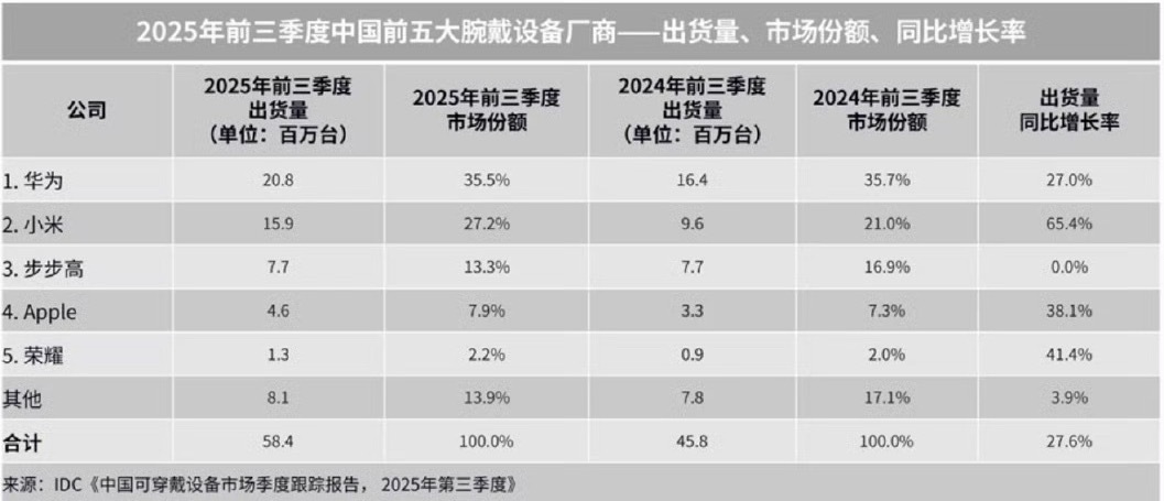 家人们谁懂啊!华子腕戴设备又悄悄拿第一了~IDC数据显示,2025前三季度全球出货量2860万台,以18.6%份额登顶第一;中国市场更猛,2080万台出货量+35.5%份额,这成绩是不是超出你的预期?