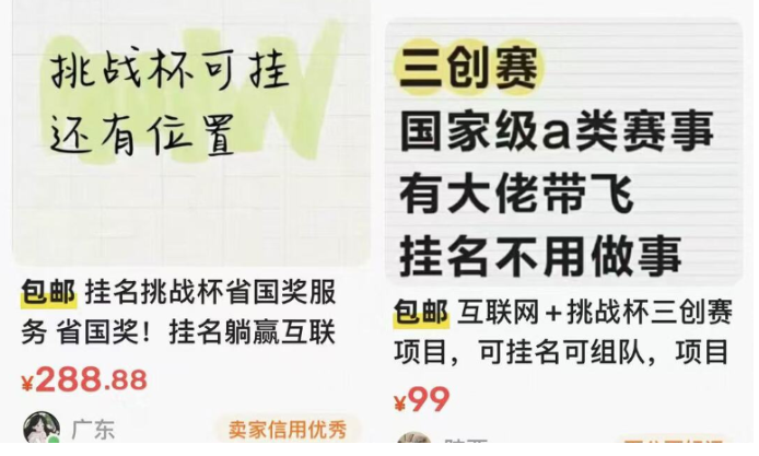 据经济参考报记者调查发现,一些中介机构,包括在校大学生,竟然通过“挂名”和“项目整体售卖”的方式,在网上明码标价出售这些赛事奖项,帮助参赛大学生“躺拿省国奖”,价格从数千元至数万元不等。