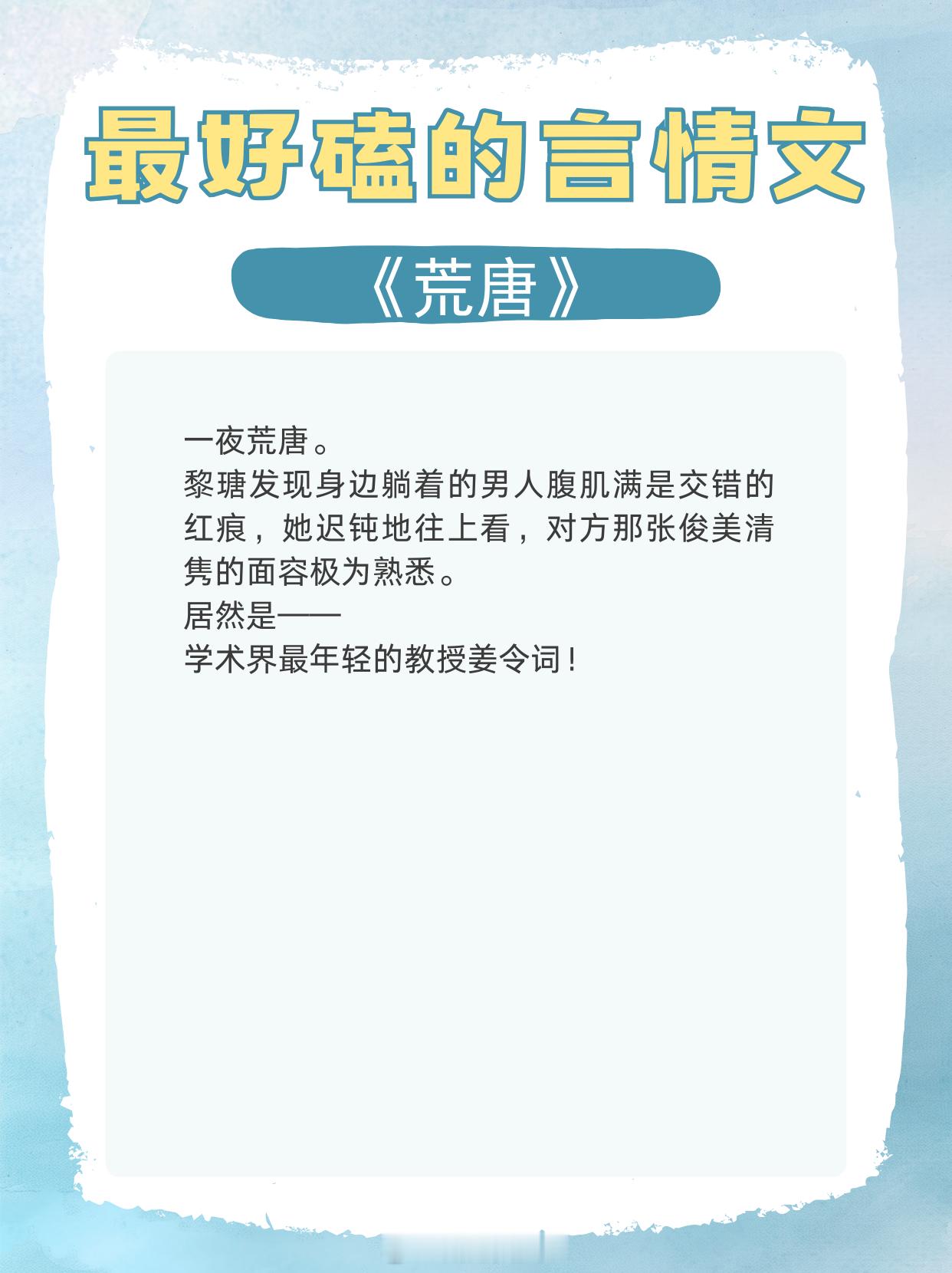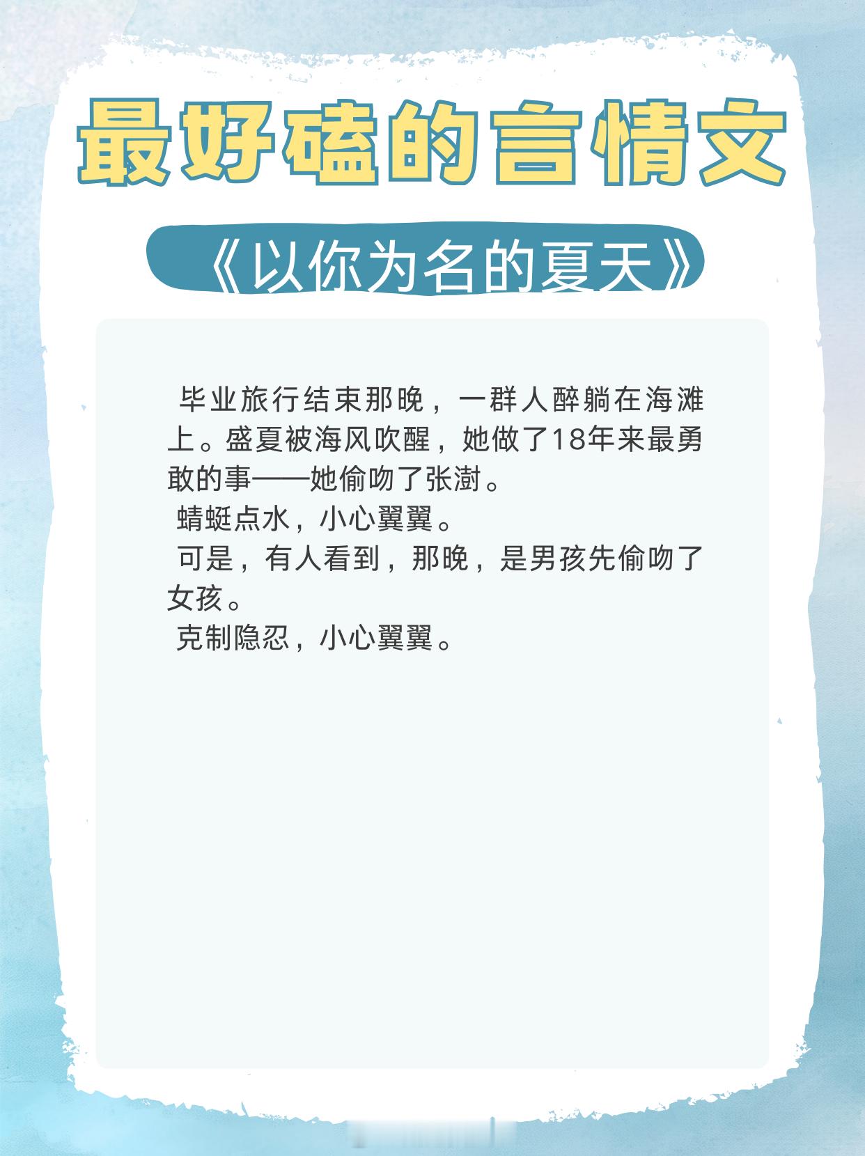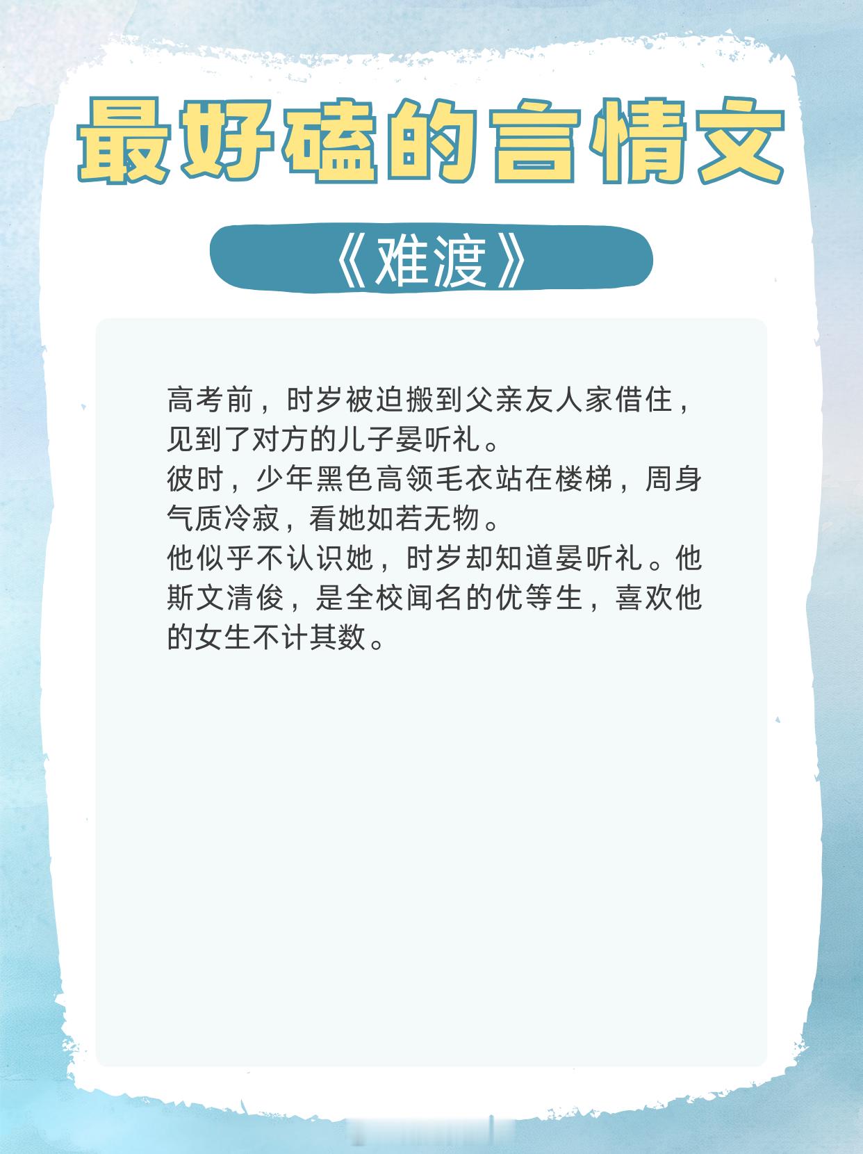 最好磕的言情文,先炙热的人,怎么变冷了。1、《囚春山》作者:曲小蛐2、《荒唐》作者:臣年3、《至死靡他》作者:千野渡4、《难渡》作者:槐故5、《致小天使》作者:白日梦羊6、《婚港》作者:希昀7、《暗恋节拍》作者:三三娘8、《野渡》作者:春风榴火9、《以你为名的夏天》作者:任凭舟这小说写在我心趴上了 这小说真的超绝
