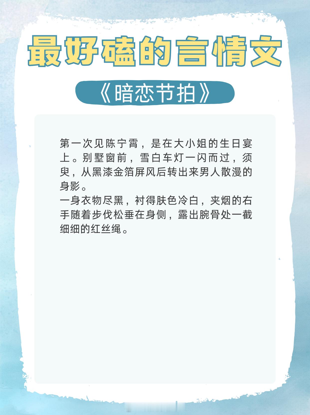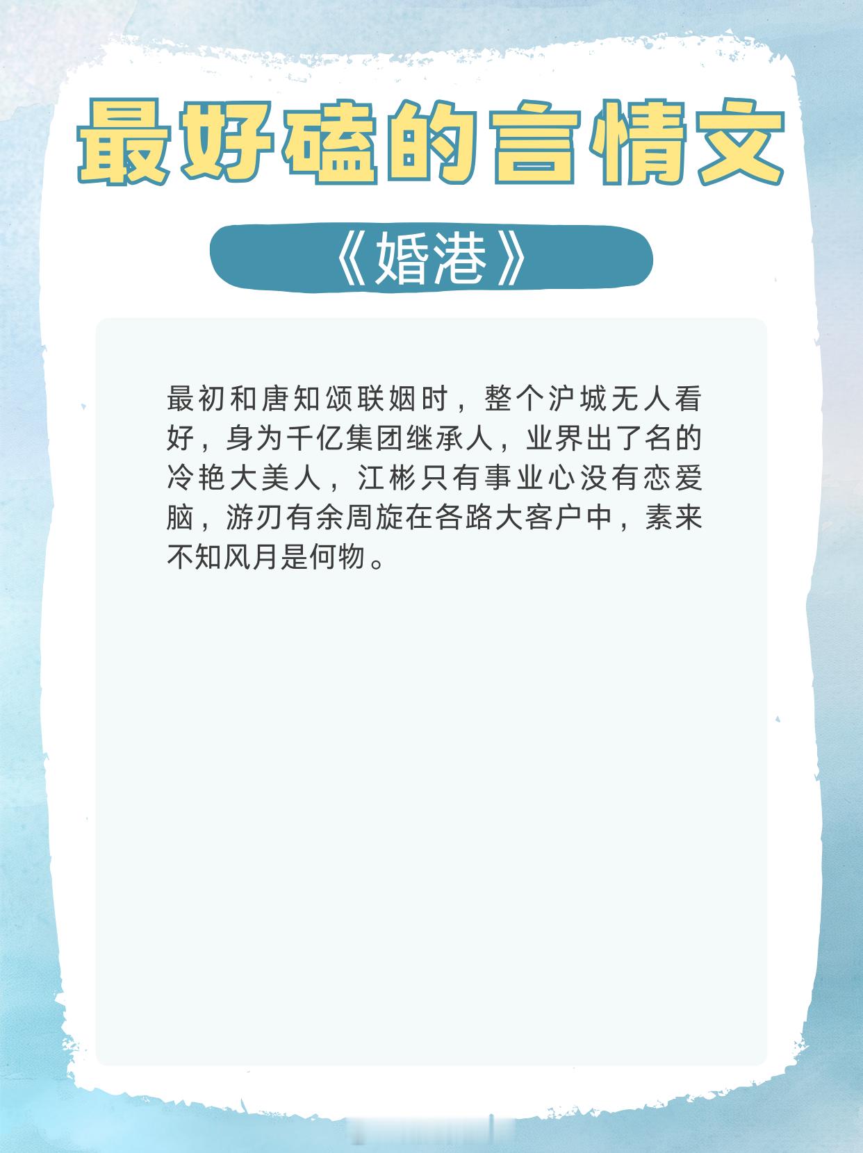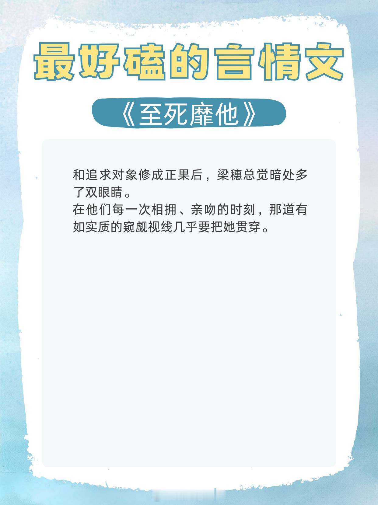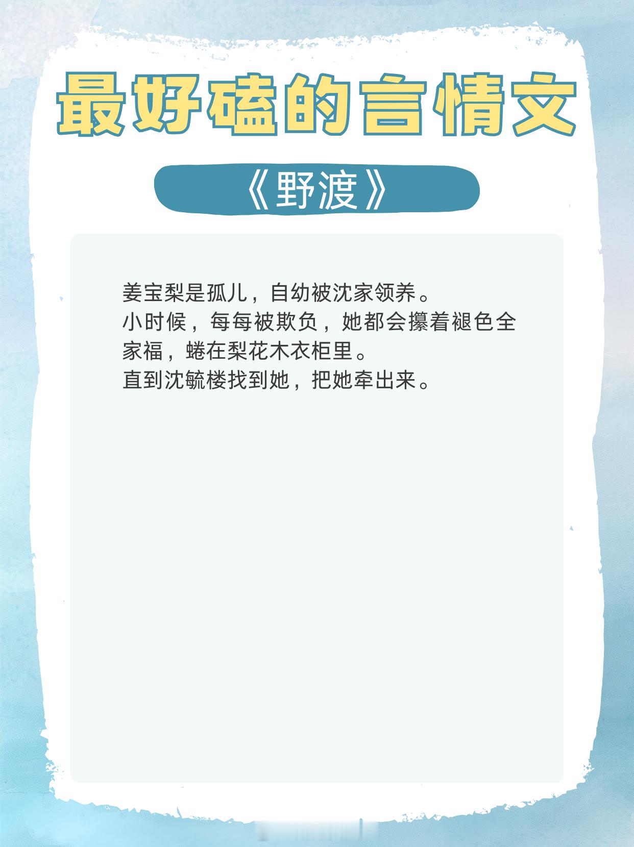 最好磕的言情文,先炙热的人,怎么变冷了。1、《囚春山》作者:曲小蛐2、《荒唐》作者:臣年3、《至死靡他》作者:千野渡4、《难渡》作者:槐故5、《致小天使》作者:白日梦羊6、《婚港》作者:希昀7、《暗恋节拍》作者:三三娘8、《野渡》作者:春风榴火9、《以你为名的夏天》作者:任凭舟这小说写在我心趴上了 这小说真的超绝