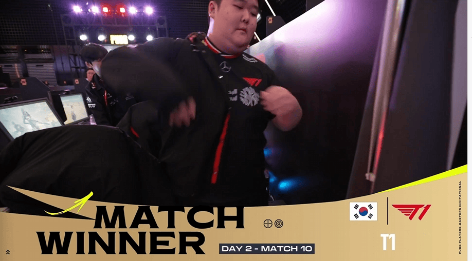 阶段6,T1进攻EA方向,EA仅剩一人存活,另外一边FW两人也被TWIS淘汰出局,同时17也选择进攻T1山头,但近点不敌T1,17也仅剩1人,TWIS也前来劝架但最终也被T1淘汰,T1成功吃鸡。