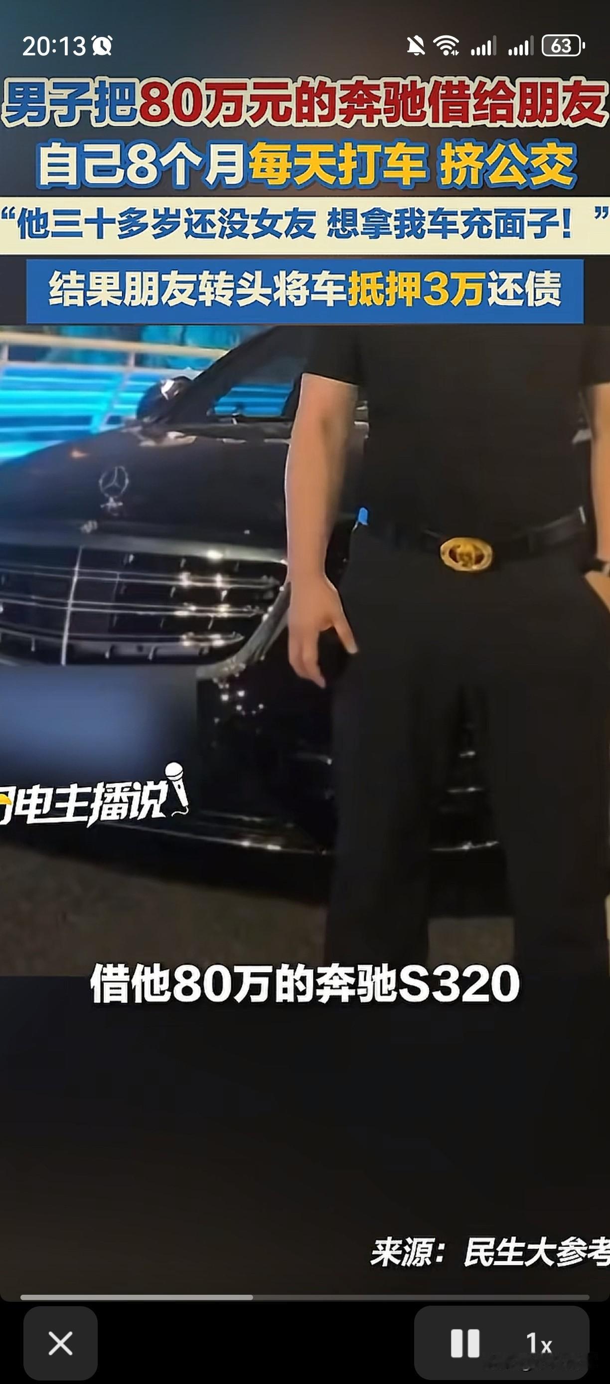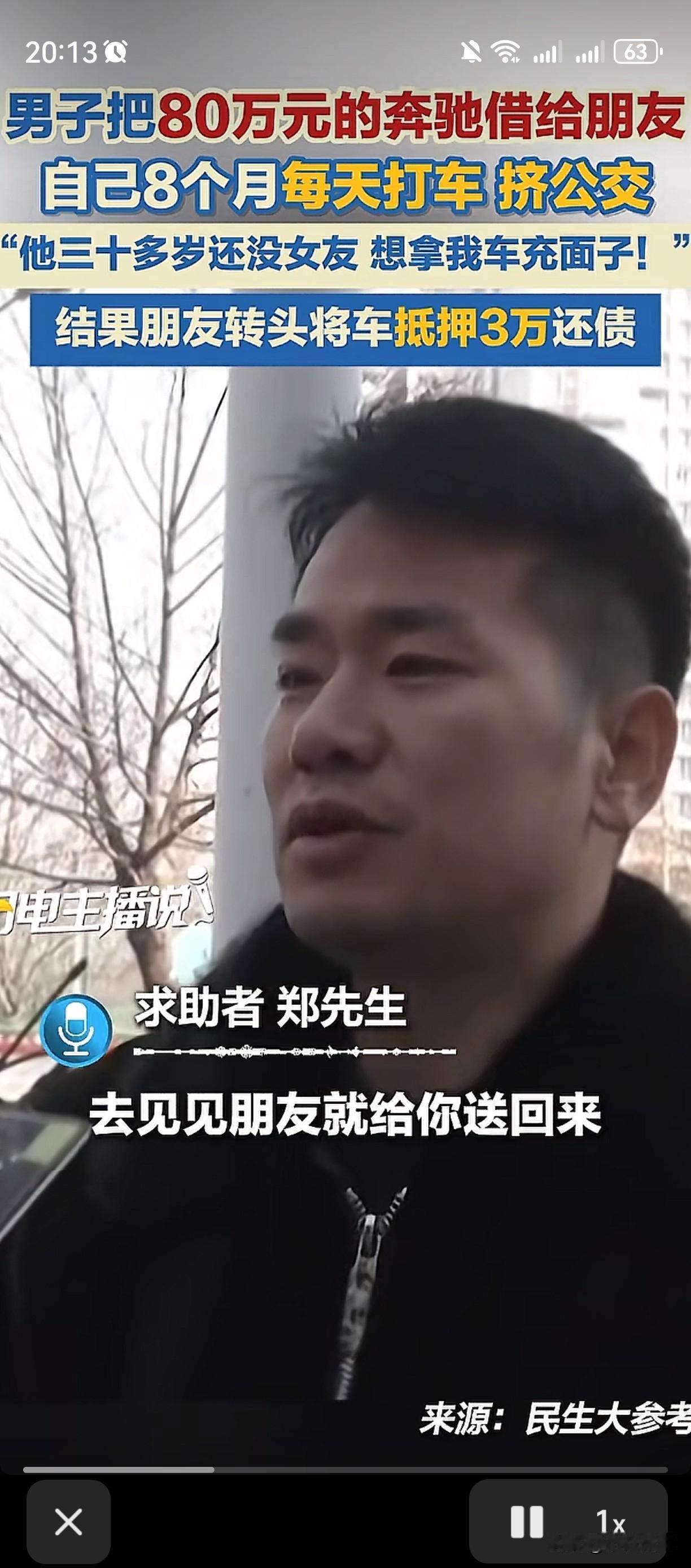 “80万的奔驰借朋友,被朋友拿去抵押3万” 近日。河南郑州的郑先生向媒体透露,他有一辆价值80万的奔驰S320,买回来开了不久,他的朋友陈先生就找他借车。 为什么要借车呢? 他朋友说现在已经30多岁了,还没有女朋友,这几天约了一个女孩子,所以想借他的车出去约约会,撑一下场面。 郑先生这一想,好朋友终于要脱单了,他也很高兴,当然愿意把车借给朋友,没想到,这车一借出去,居然整整8个月都不见车影,在这期间,郑先生没有车开了,上下班坐公交车或者是打滴滴。 当然了,他也一直在催朋友还车,可是,对方却一直以各种理由拖着,直到后来实在瞒不住了,他朋友告诉了他一个坏消息,这车被他拿去抵押给私人,贷了3万块钱还债去了。 什么?车被拿去抵押了? 听到这个消息,郑先生简直不敢相信,瞬间一阵无语,这么贵的车,作为朋友说借就借,而且借出去这么久也不怀疑,可见他对朋友真的够意思,试问有哪个人能像他一样,为了能让朋友脱单,他居然整整8个月委屈自己,出门坐公交打滴滴,可是他的朋友,居然把他的车拿去抵押还债,这是什么猪朋狗友。 事情到了这一步,他朋友陈先生也觉得不好意思,这段时间他也在想办法找钱把车赎回来,毕竟也只是3万块钱而已,问题还是挺挺容易解决的。 问题是,这车的主人是郑先生,对方把车抵押给别人,别人又是怎么就敢收这辆车呢? 对此,你们怎么看?