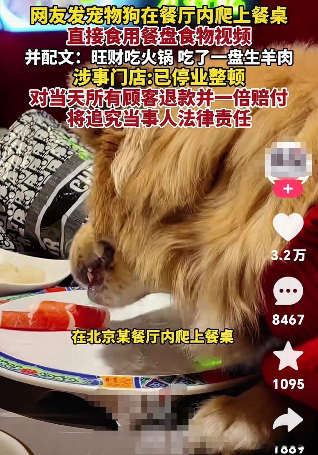 令人气愤,网友发视频宠物狗在餐厅内爬上餐桌,直接食用餐盘食物! 并配文:旺财吃火锅,吃了一盘生羊肉! 12月18日网上流传的一段视频太让人无语了。视频里,北京王爷府南门涮肉某店,一只宠物狗爬上餐桌,直接吃起了餐盘里的生羊肉卷,连盘底都舔了。发视频的女子还夸“牛!太厉害了”,配文“旺财吃火锅,吃了一盘生羊肉”。 这事儿引发网友一片批评声,大家觉得太过分了。狗主人分不清内外,在餐厅让狗上桌,实在没素质,道德缺失。 而且餐厅也有监管责任,虽说店员事后做了处理,还停业整顿、退款赔付,但还是让人觉得膈应。要是我就餐时遇到这情况,估计这顿饭都吃不下了。