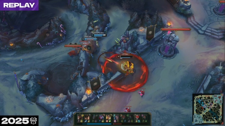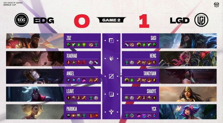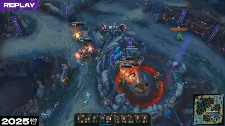 [15:41]中路河道团战,Ycx妮蔻开两人但无济于事,LGD四散而逃被逐个击杀,shaoye中路清兵后被杀,EDG打出0换3,经济领先7k。