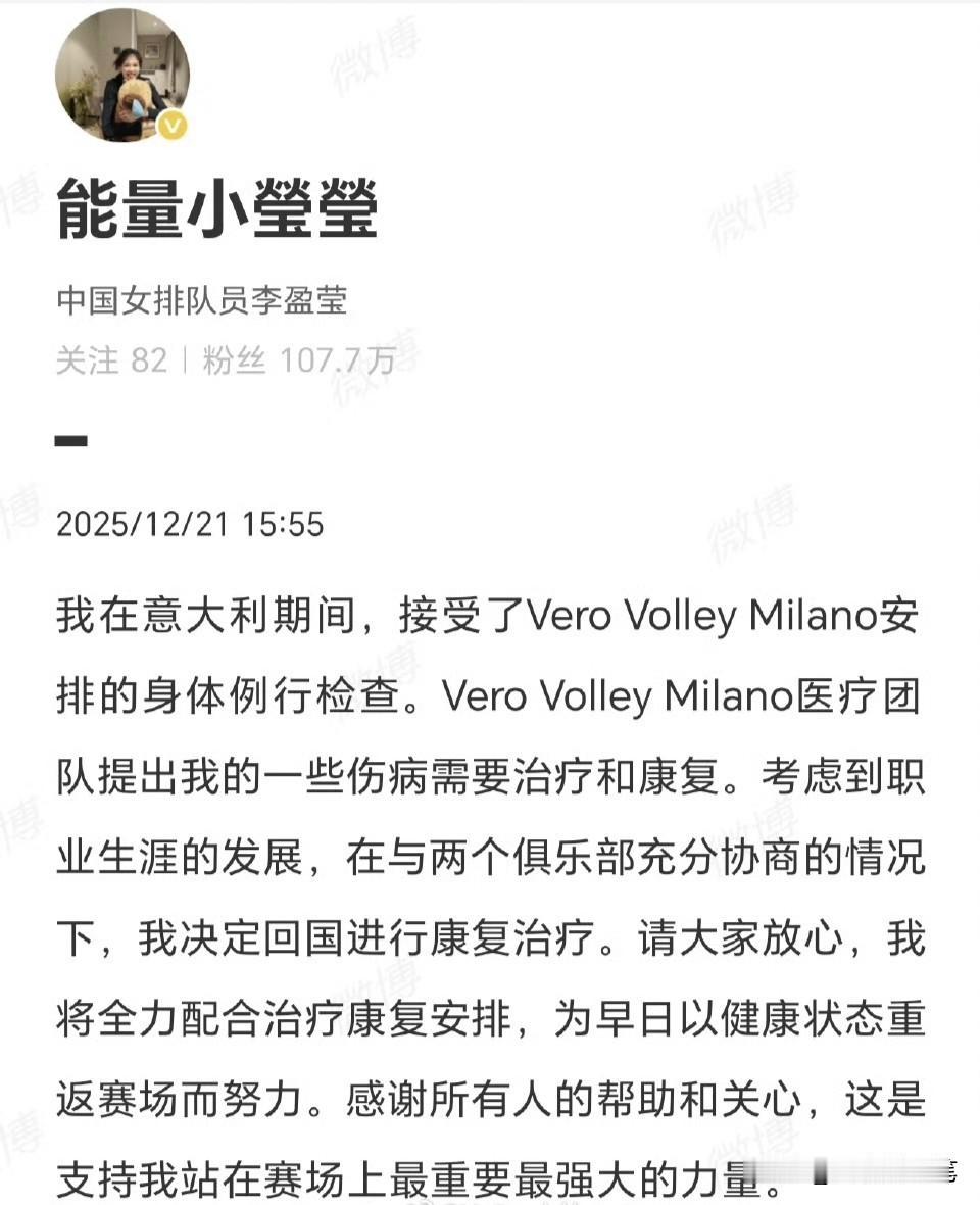 李盈莹官宣,意甲米兰之旅结束[捂脸]她要回国康复休养 原来米兰俱乐部最先提出了分手,由于妹妹的体检报告显示,她的身体不足以承担比赛的重任,需要先康复治疗。足见国外俱乐部很注重运动员的健康,也是个好事,要是不出国,还不是继续留在天津女排卖力地扣球和擦地板。好好休息,等你健康回来。