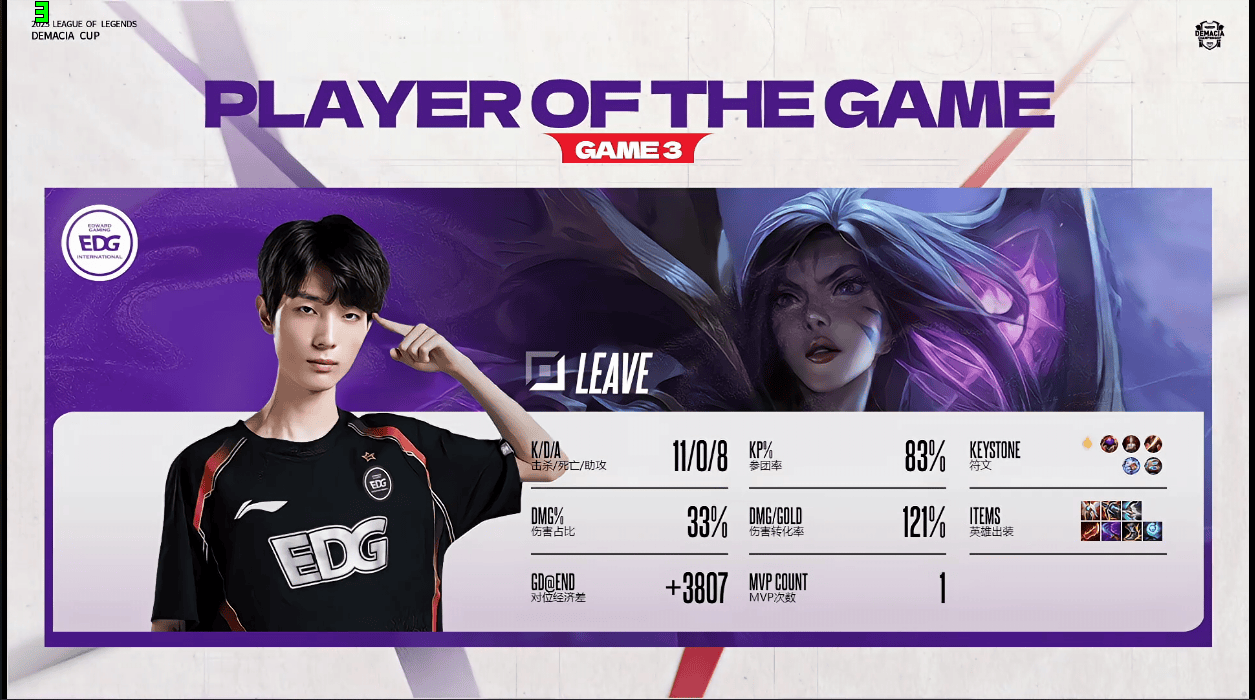 Leave卡莎打出11/0/8战绩,斩获EDG对阵LGD第三局MVP