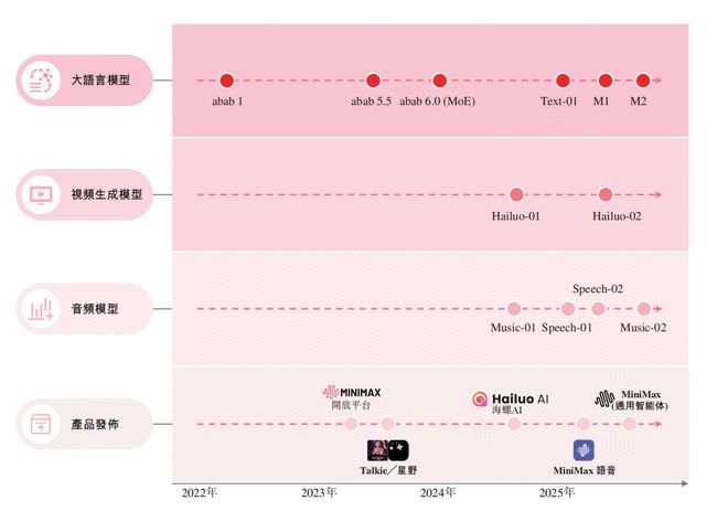 语音领域,MiniMax于2023年推出国内首个基于Transformer架构的语音大模型Speech01,随后在2024年将综合性能提升至全球第一的Speech02,累计已生成超过2.2亿小时的语音。