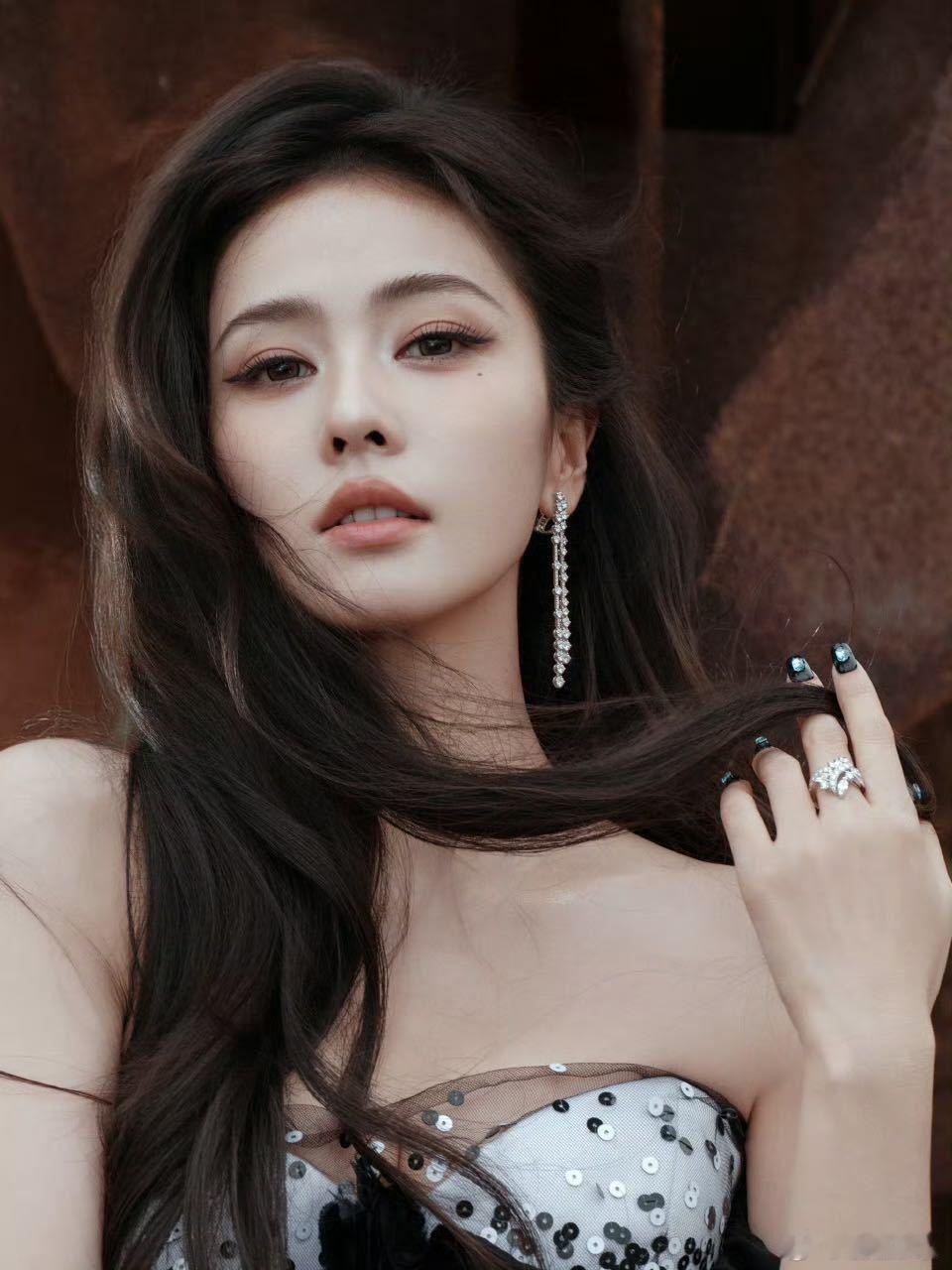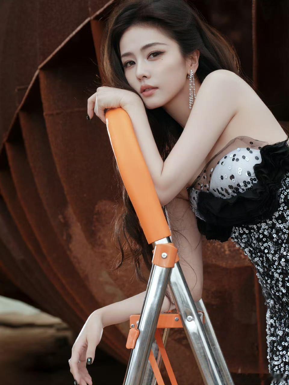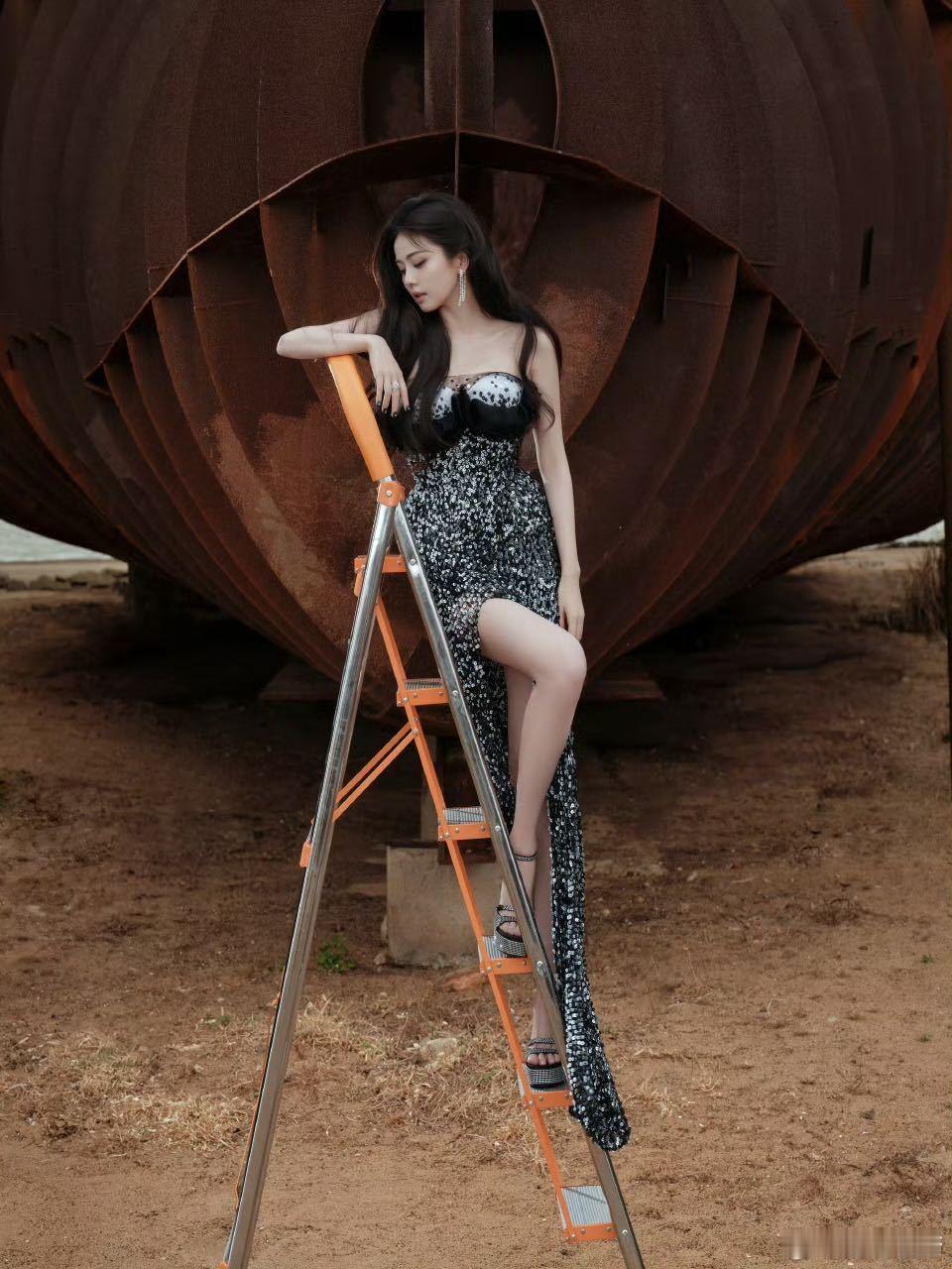 白鹿海边星光与礁石共舞,一袭流光长裙勾勒优雅轮廓沙滩与锈迹铁架碰撞,黑纱裙绽放野性魅力。白鹿高定女王一天两套