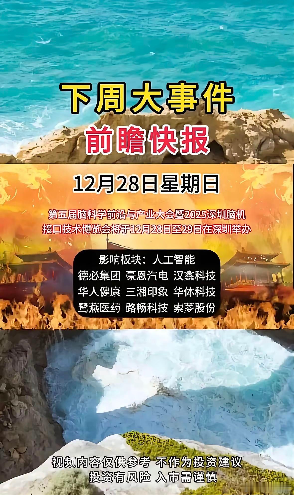 下周大事件前瞻快报:12月28日,深圳脑机接口技术博览会,关注人工智能板块!"智元机器人下周发布擎天租平台,人形机器人板块引关注,涉及豪恩、均胜等企业。投资需谨慎,市场动态把握时机。"