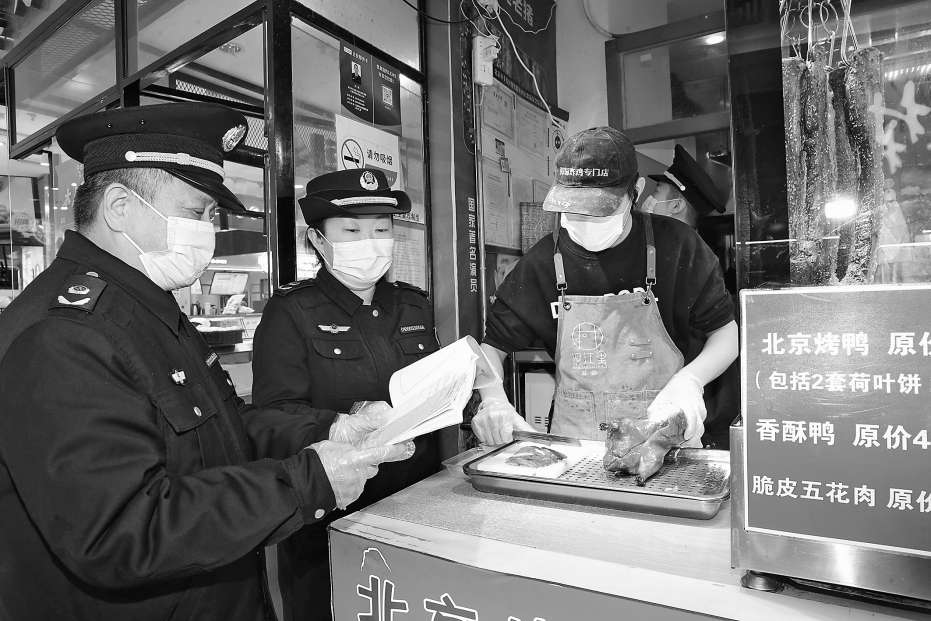 近日,北京市丰台区市场监管局对首航商业综合体开展食品安全专项督查工作。执法人员重点检查综合体内部餐饮店、食品经营店等经营主体采购的食材是否新鲜、生熟食品是否分区存放、后厨“三防”设施是否配备等情况。本报记者董芳忠摄影报道