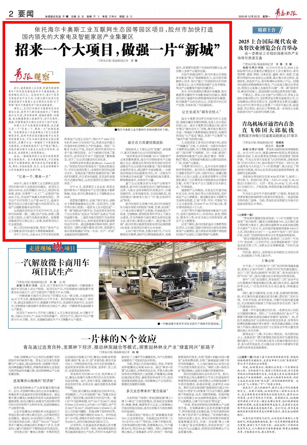 事实上,自2022年海尔卡奥斯项目启动建设以来,胶州市已招引落地海尔上下游配套企业25家,涉及新材料、高端压缩机、冷凝器、热交换器等核心配套环节,其中尼得科、康盛、科隆等诸多头部企业项目已投产运营。