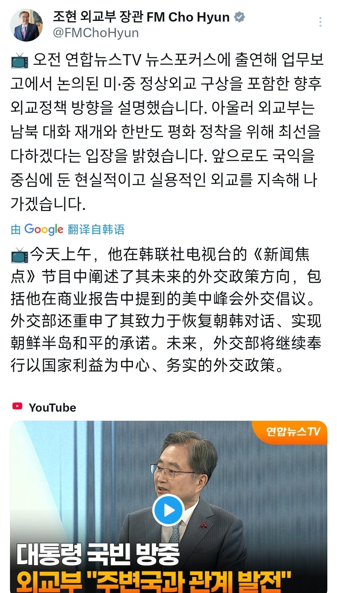 12月22日上午,韩国外长赵显在韩联社的电视节目上介绍了明年的韩国外交政策规划,