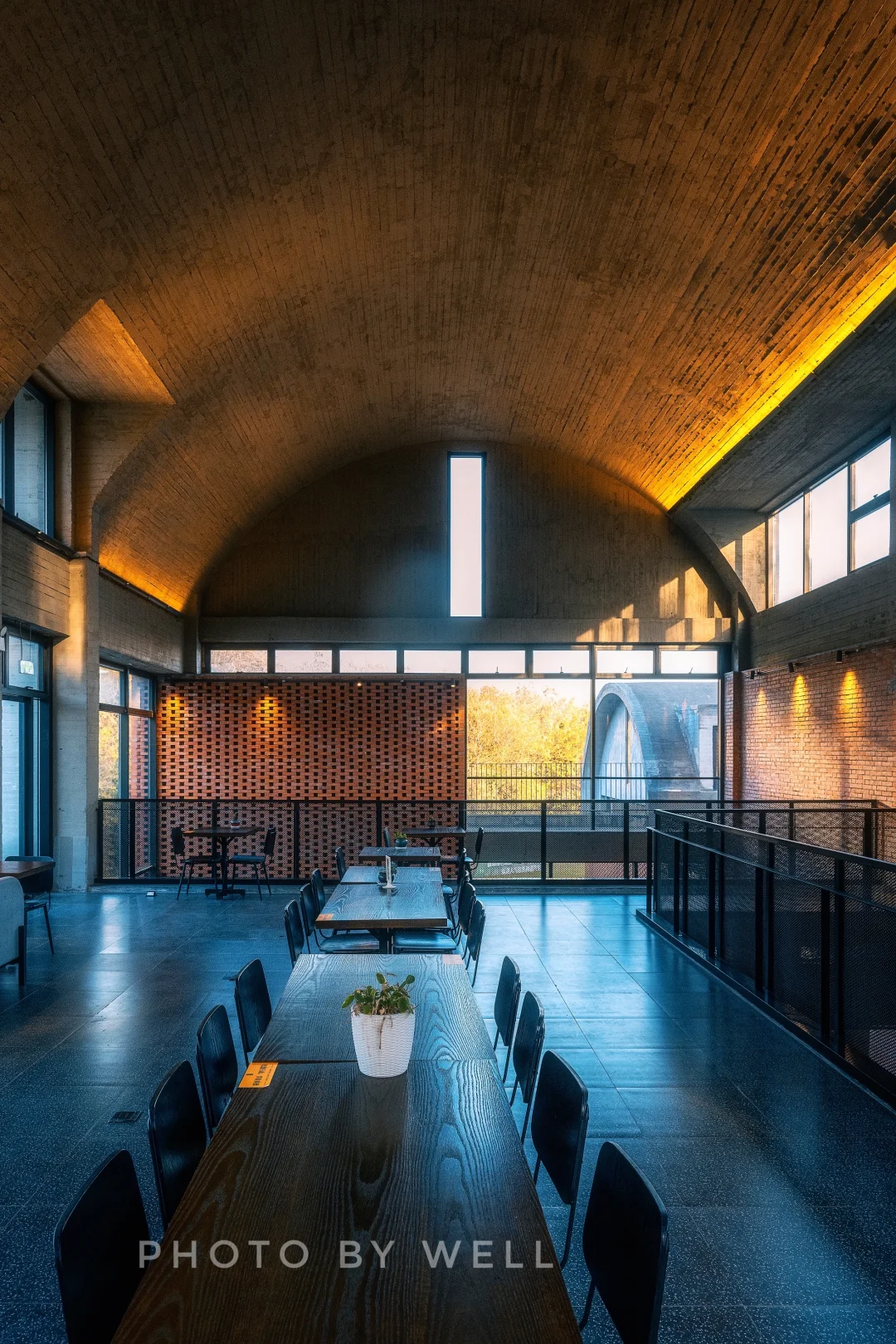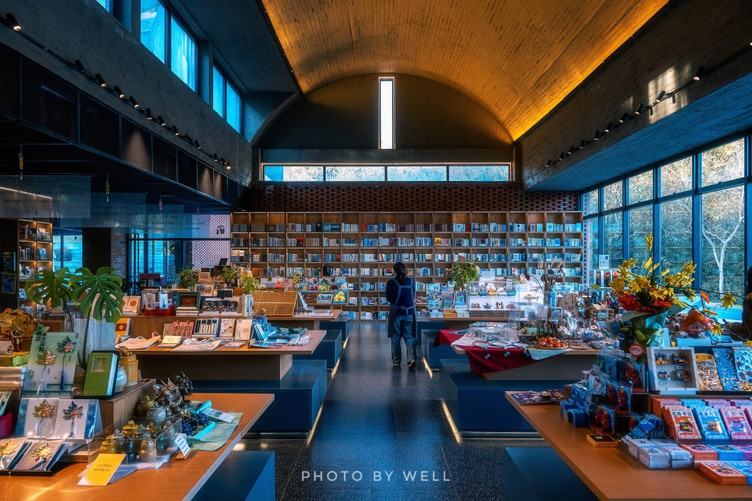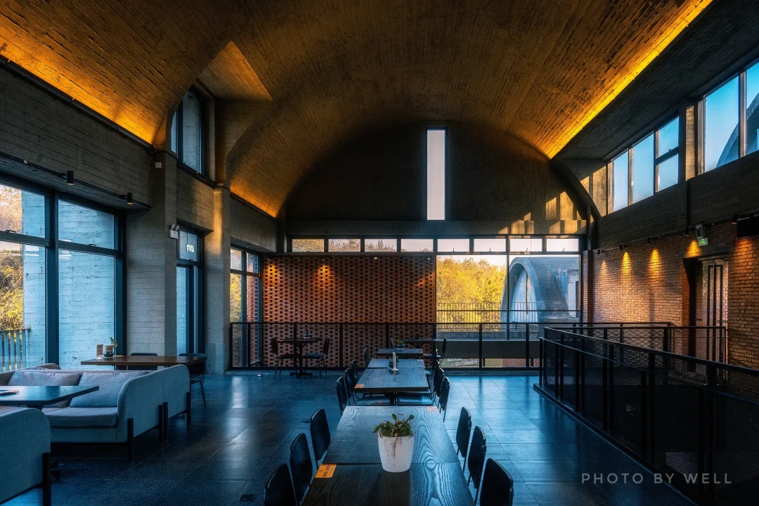 书店建筑保留了场地上原有20余米高的两个红砖灰窑塔。新建筑以木模压纹混凝土拱顶和红砖元素巧妙继承了场所精神,根据地势特征沿山势而上,分成三个空间。