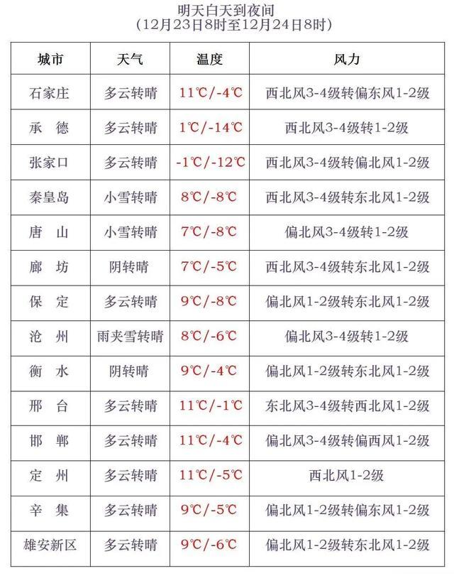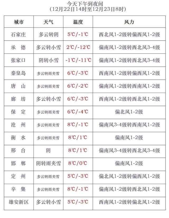 今天下午到夜间,全省多云转阴,其中张家口、承德、唐山北部、秦皇岛北部、保定西部和北部、廊坊北部、石家庄西部山区有小雪或零星小雪,唐山南部、秦皇岛南部、保定南部、雄安新区、廊坊南部有雨夹雪转小雪,石家庄东部、沧州、衡水、邢台东部、邯郸东部有雨夹雪或小雨。