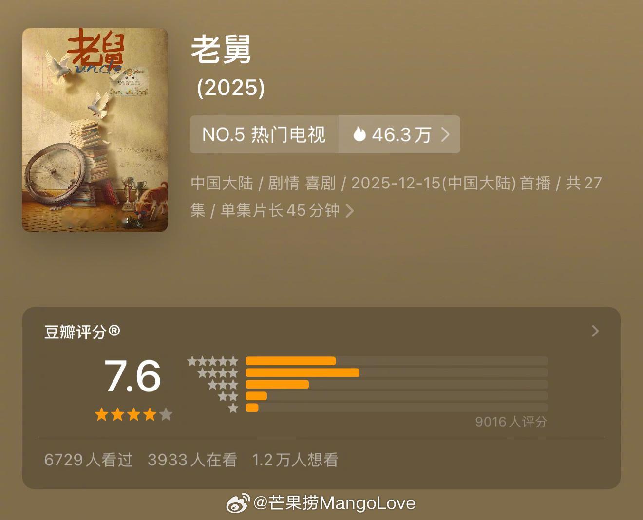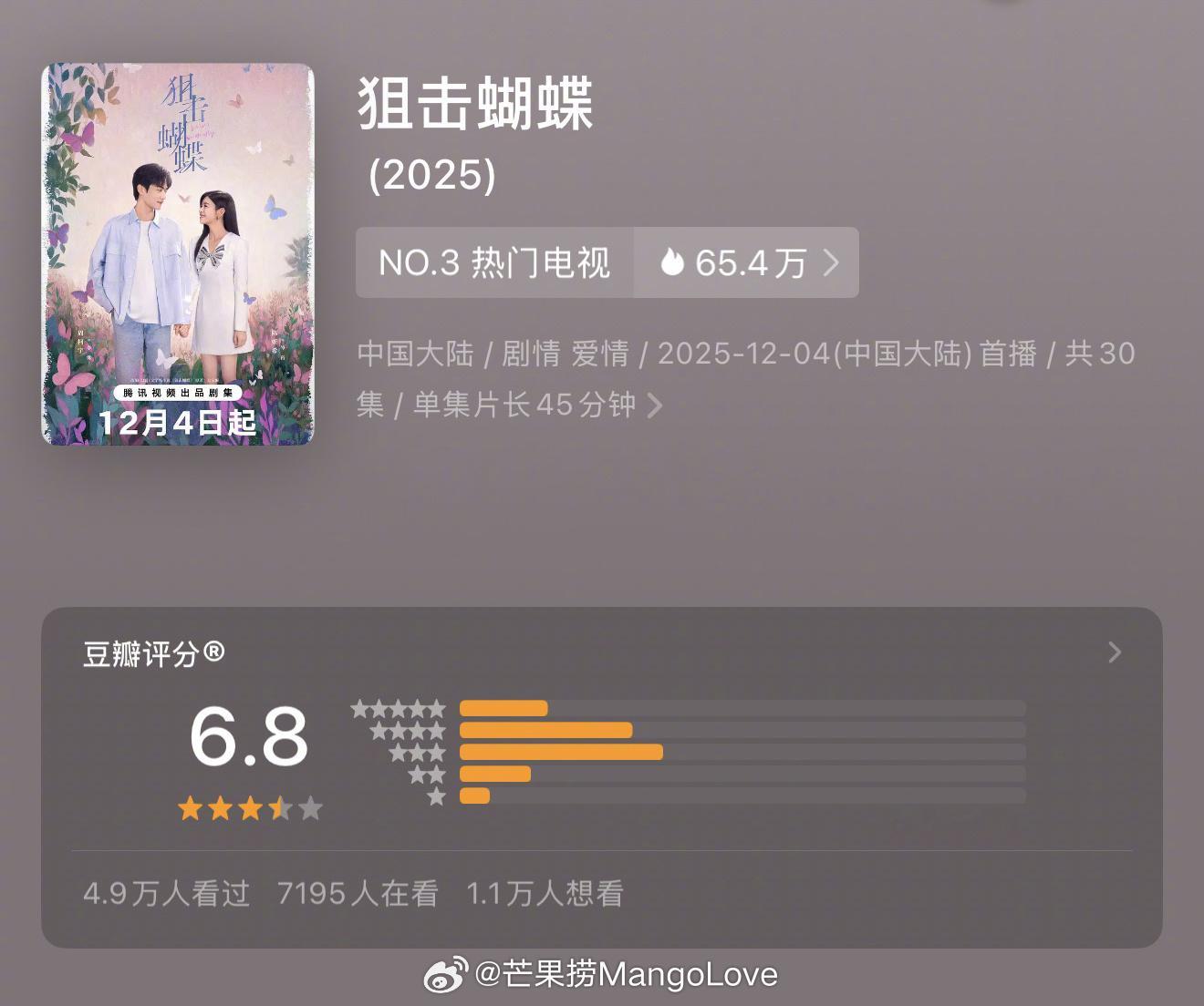 近期热播剧集豆瓣评分开分江奇霖 / 章宇 / 尹正 / 兰西雅 / 韩静 反人类暴行 8.6分郭京飞 / 王佳佳 老舅 7.6分罗晋 / 任素汐 / 周游 / 胡杏儿 / 王子川 / 孙安可 时差一万公里 7.1分陈妍希 / 周柯宇 狙击蝴蝶 6.8分胡先煦 / 周依然 / 何蓝逗 / 加奈那 / 李乐 / 黄婷婷 即刻上场 6.8分