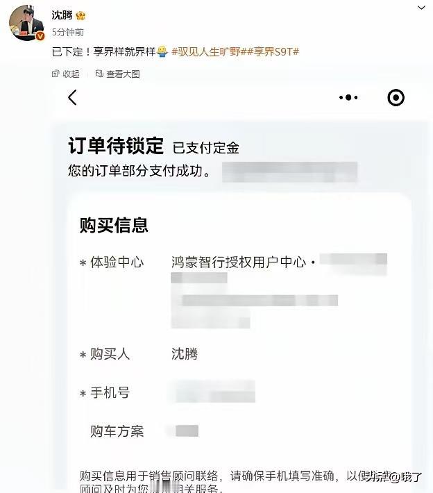余承东是怎么说服沈腾给他做广告的? 沈腾发文说自己已经买了享界的汽车,为了增加可信度,他不光贴上了享界汽车的车辆照片,还把自己的订单也一起贴上了。 沈腾买的这款车是享界S9T增程版本,使用的是37度的电池包,并配有仙踪锋绿颜色,价格为364800元。 不过沈腾还是很有眼光的,当时华为那边要开发享界S9T之前大家伙可没少争论,这毕竟是一款旅行车,包括北汽的研发团队,心中也觉得有些担忧,觉得这车实在太小众了,后来好多人都投了反对票。 最后还是余承东力排众议,他给了个理由说,人不能只过日子,还要有诗和远方。最后还是有了这款车。从目前的销售状况来看,余承东当年的坚持是对的。【来自懂车帝车友圈】