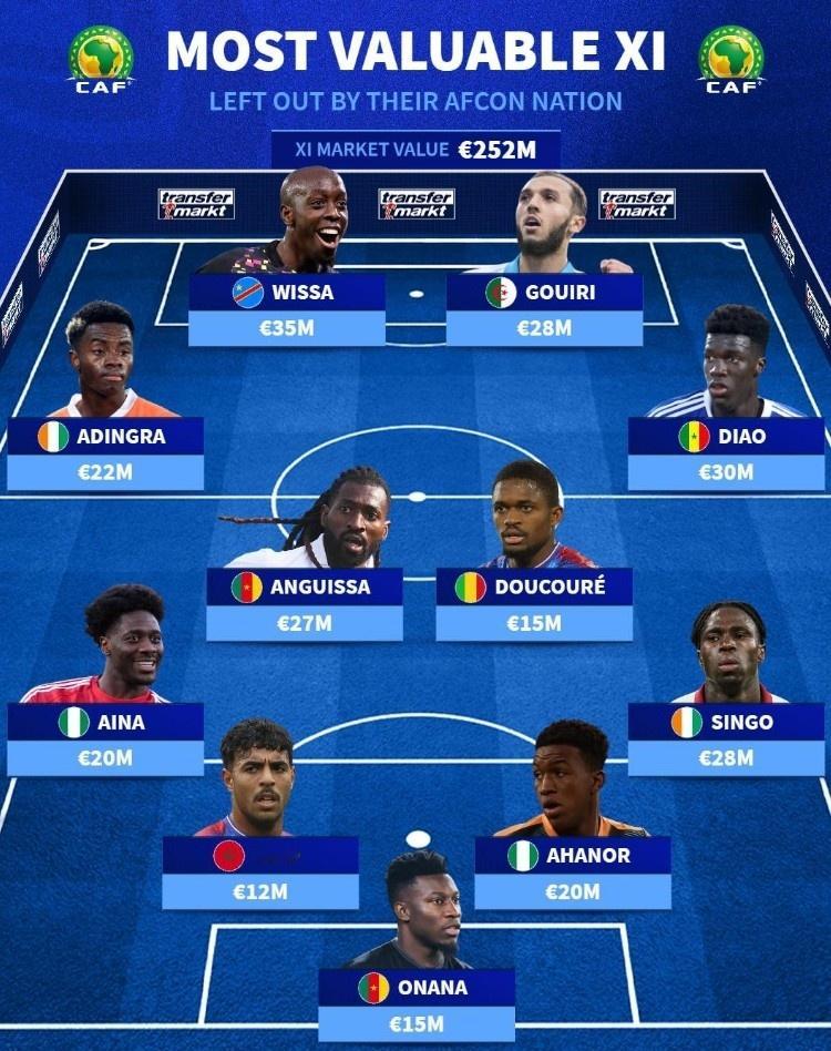 德转列非洲杯落选最贵阵:总身价2.52亿欧元前锋:维萨(民主刚果,3500万)、
