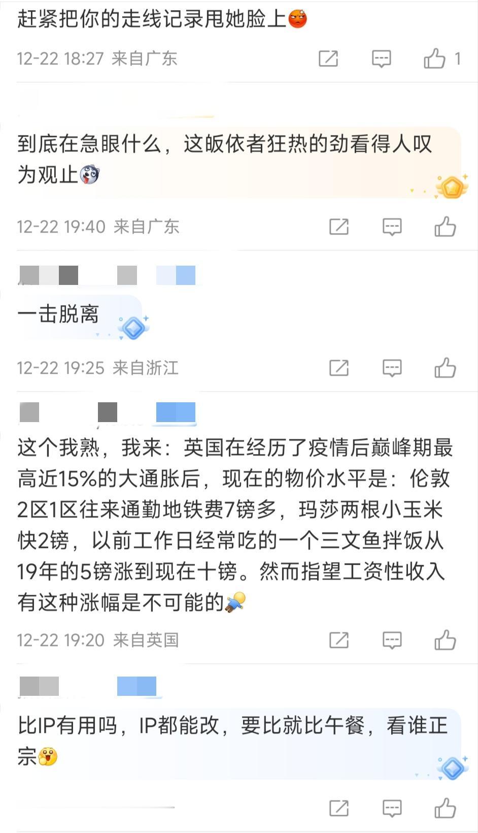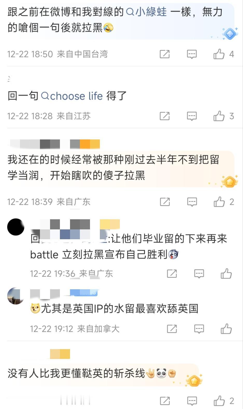 一年水硕情,一世英伦情。 最近有关牢美斩杀线论在国内外中文圈大热,当有人想谈一下英国斩杀线时,一个英国ⅰP却容不得别人谈论呆英斩杀线。 一个曾留学英国,现在在国内上班的一个博主,想谈一下呆英斩杀线,结果却被一个英国iP嘲笑,并迅速拉黑。 如果有人怼他一句:水硕签证快到期了,拿到身份了没?!将是绝杀。 翻译过来的意思就是:重生之你在安全区聊没落帝国斩杀线,你没格! 你如果要是是英国iP,他又会说:呆英这么不好,你咋不回去。或者他又要说:你快回去吧,村里又发金条了。主打一个立体防御,“他要他以为,不要你以为”。