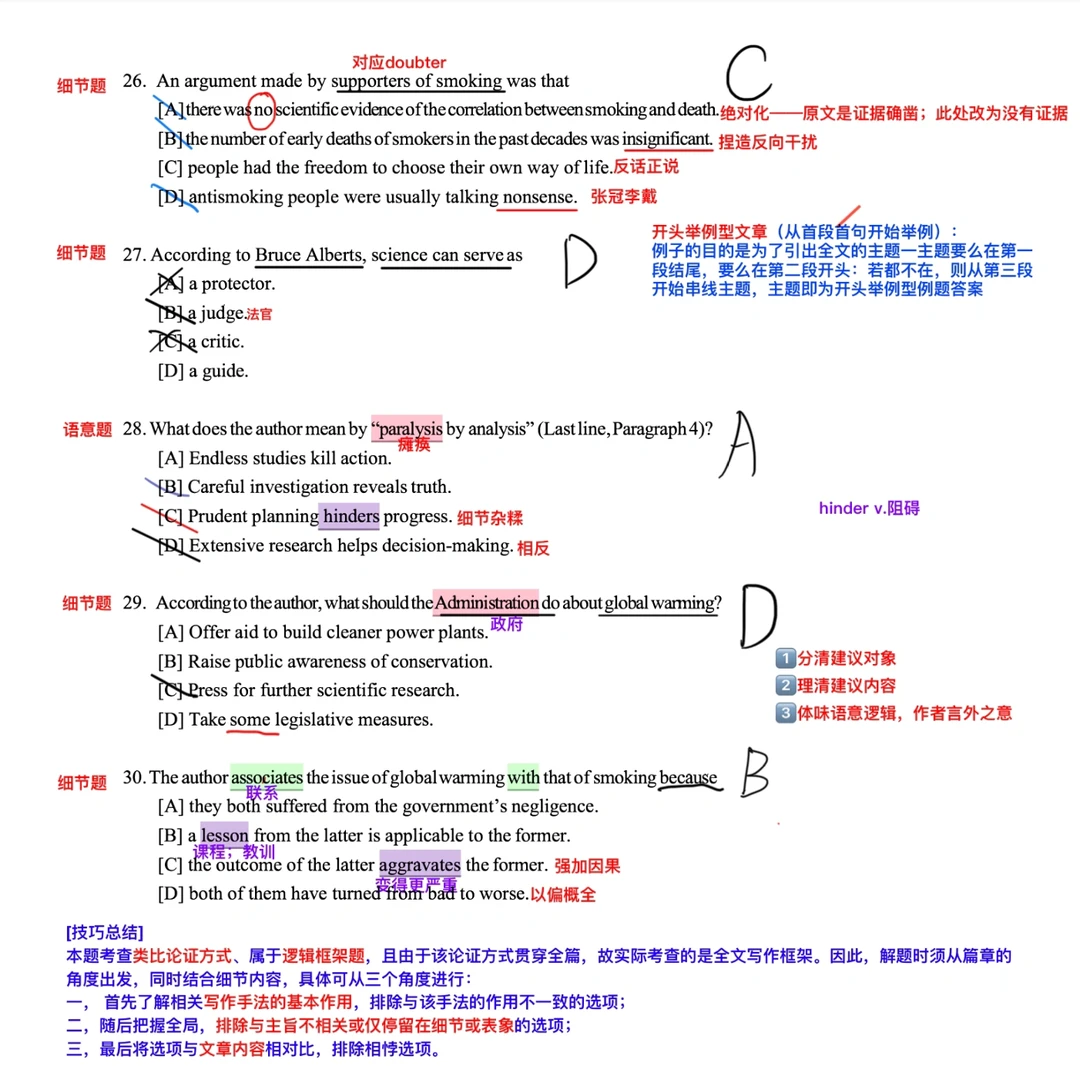 【30题】本题考查类比论证方式、属于逻辑框架题,且由于该论证方式贯穿全篇,故实际考查的是全文写作框架。因此,解题时须从篇章的角度出发,同时结合细节内容,具体可从三个角度进行: